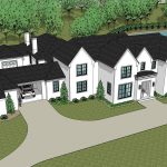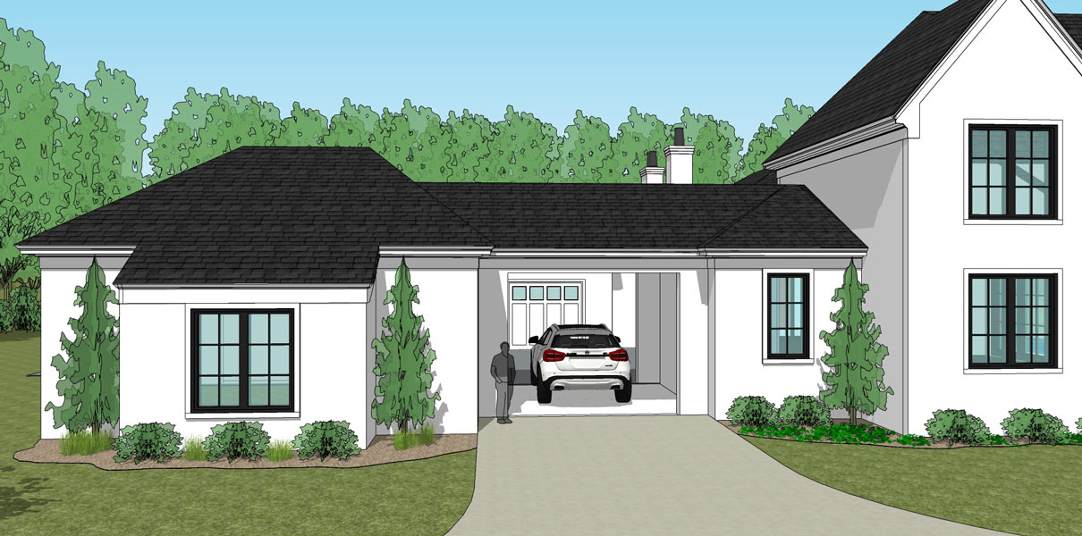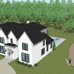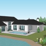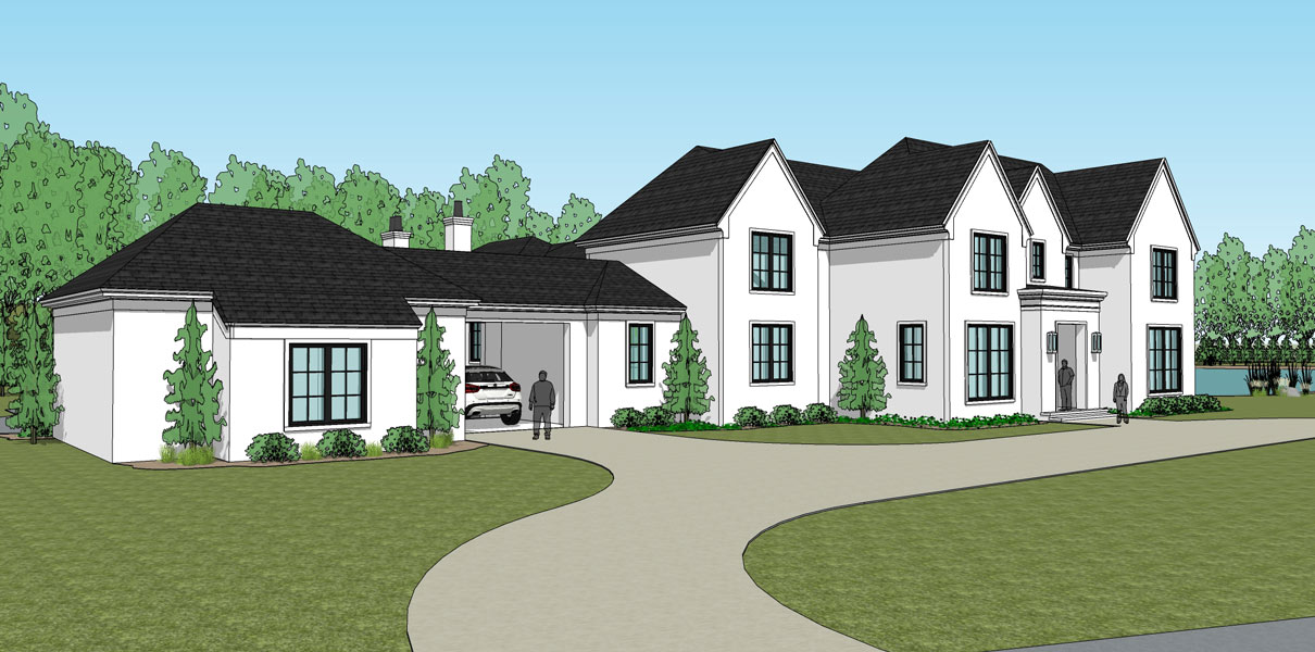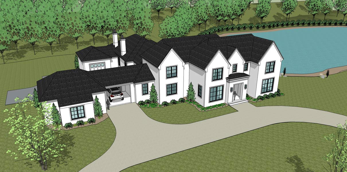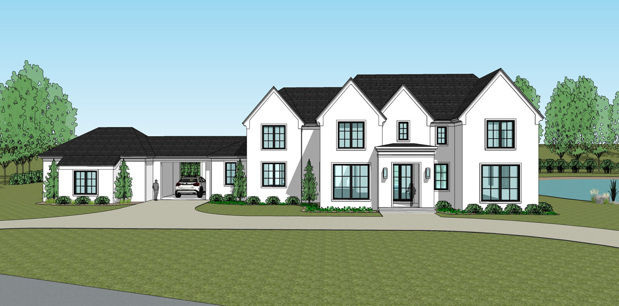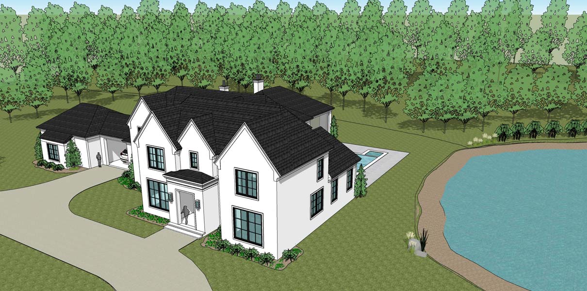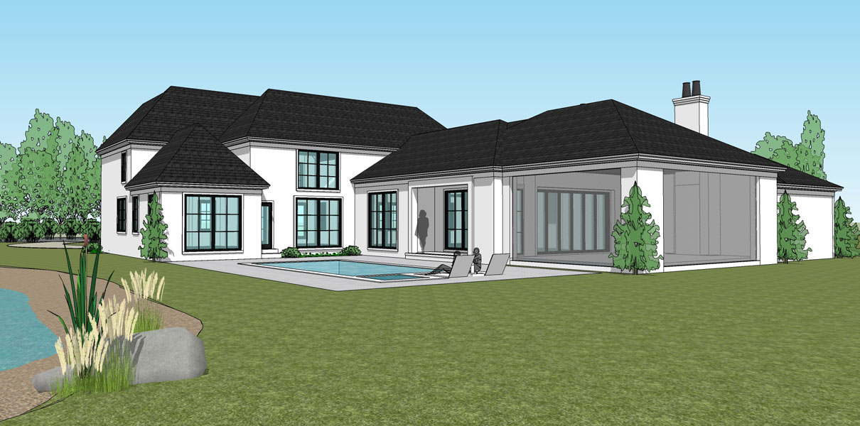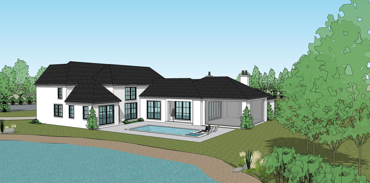 This modern estate sits tucked away on a quiet 2-acre lot. A porte-cochère welcomes the owners to a private court with direct access into the heart of the home. Inside, tall windows flood the space with natural light and provide uninterrupted views of a heavily wooded backdrop and the adjacent private pond. The living area gives way to a large covered porch with more than enough space to host parties and family get-togethers. The covered porch leads directly out to the pool deck, where the pool acts as a visual extension of the neighboring pond.