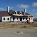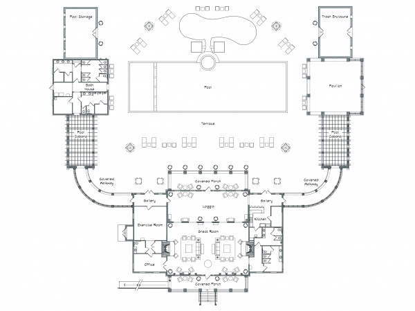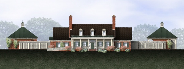 The Clubhouse at Kennesaw Farms was designed to become the centerpiece of community entertainment in this Traditional Neighborhood Development, and to carry the rich, historical tradition and equestrian theme throughout. The clubhouse can accommodate large gatherings, or it can be partitioned for smaller venues. The site is situated on the terminating axis of a major boulevard within the neighborhood, to which the building responds accordingly. Due to the amount of vehicular traffic surrounding the building, the clubhouse was designed with radiating verandas terminating in pool house pavilions. The pavilions not only emphasize the street pattern but also provide privacy for swimming pool users from traffic.