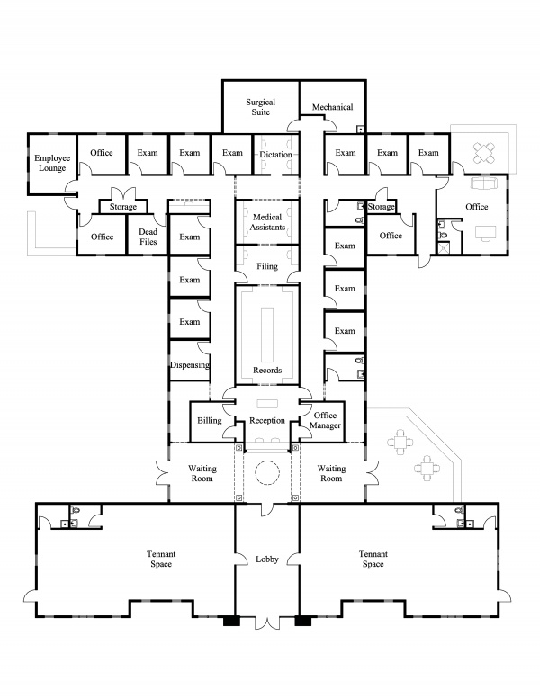 This medical clinic, located in Laporte, Indiana, was designed by Shapiro & Company to meet all of the needs of the tenant in one building. The clinic includes a reception/waiting area, records storage, a billing office, 12 exam rooms, and an outpatient surgical suite. The building also includes 2 additional tenant spaces.