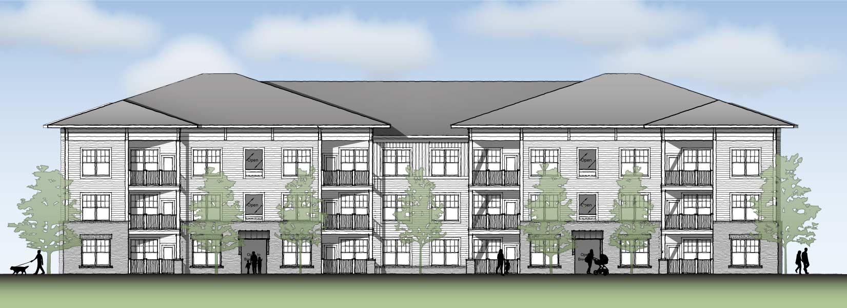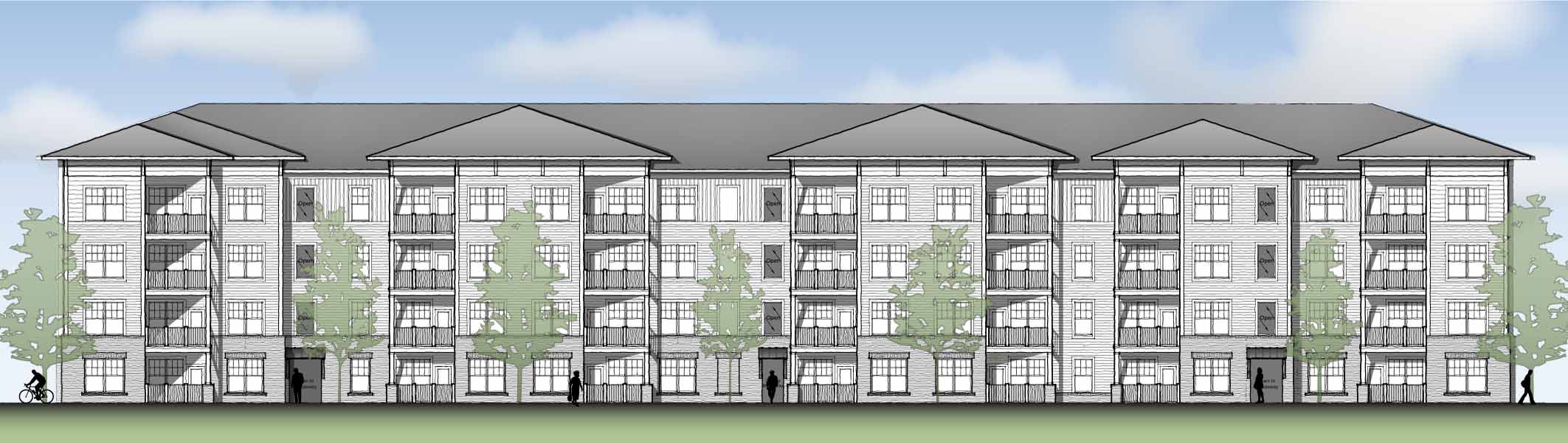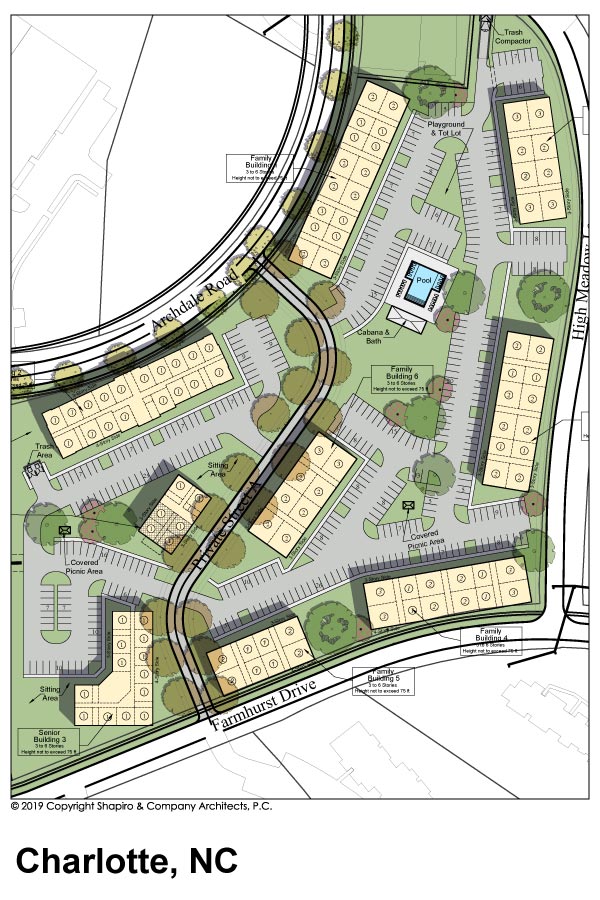 Archdale is a combination of 2 sites: Independent Senior Living and Market Rate Apartments. The Market Rate apartments consist of 6 three or four-story buildings and 204 dwelling units. Units will include a mix of 1, 2, and 3-bedroom units. Amenities will include a Playground and Tot Lot, and a Pool with Cabana with a Bathroom. The Independent Senior Living apartments consist of 3 three or four-story buildings with 132 1-bedroom units. Amenities to include Common Laundry, a Fitness Area, a Multipurpose Room, and a Business Center. The detached Clubhouse will be shared with both the Senior Living and the Market Rate residents. The master site plan was designed where the buildings line the street with parking courts behind the buildings for a more urban feel in a suburban location.