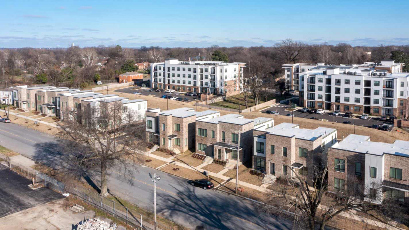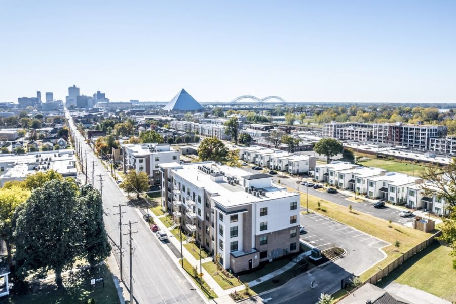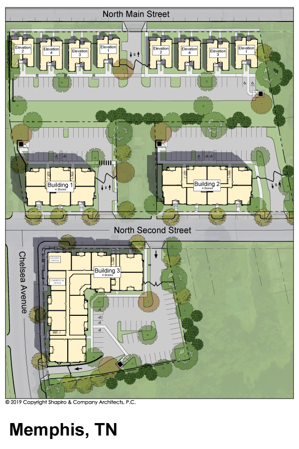 In an older edge of the downtown Memphis area, Burkle & Main hopes to revitalize the area using a modern interpretation of the existing warehouses in the area. The project consists of 3 four-story apartment buildings and 8 duplexes. The HUD Financed apartments include 110 dwelling units with a mix of 2 and 3-bedroom units. The duplexes consist of 4 elevations and each are 2-story buildings with 4-bedrooms and 2 bathrooms. Amenities include Leasing Office with Common Laundry and a commercial space.