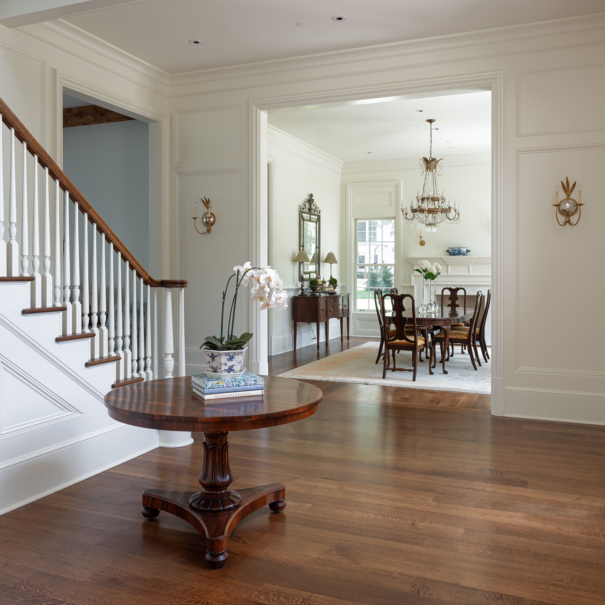 This classical French Georgian style home is located in the historic district of Hernando, Mississippi. The clients wished to keep a symmetrical façade with a formal and organized look. As well as, many views of the French-inspired courtyard.