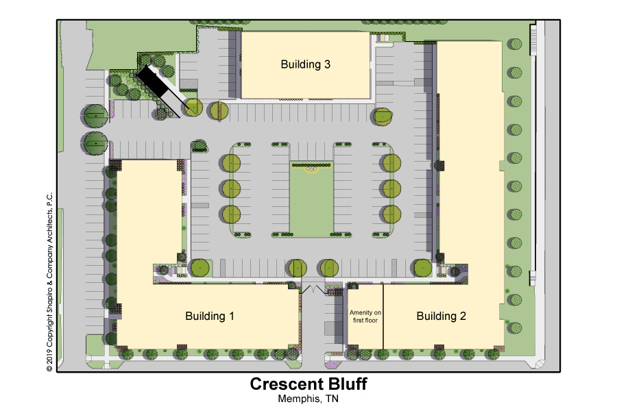 Crescent Bluff Phase II Apartments, is a 172 unit project on 4 acres in downtown Memphis. The project consists of studio, one and two-bedroom units with a Leasing / Clubhouse facility. The units will range from 1,150 to 1,350 square feet.