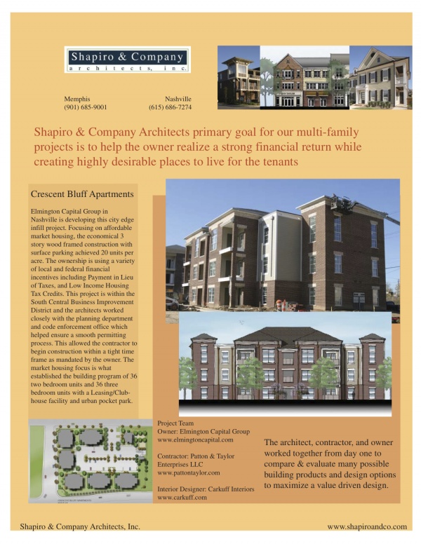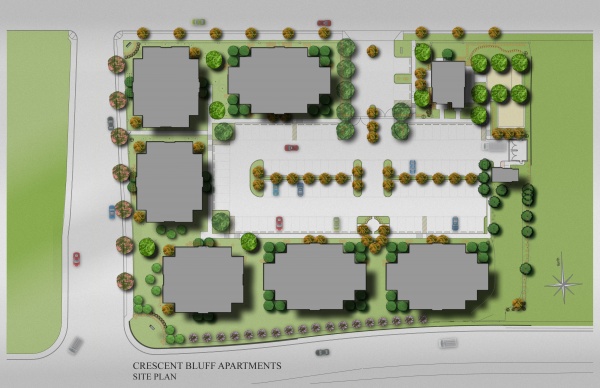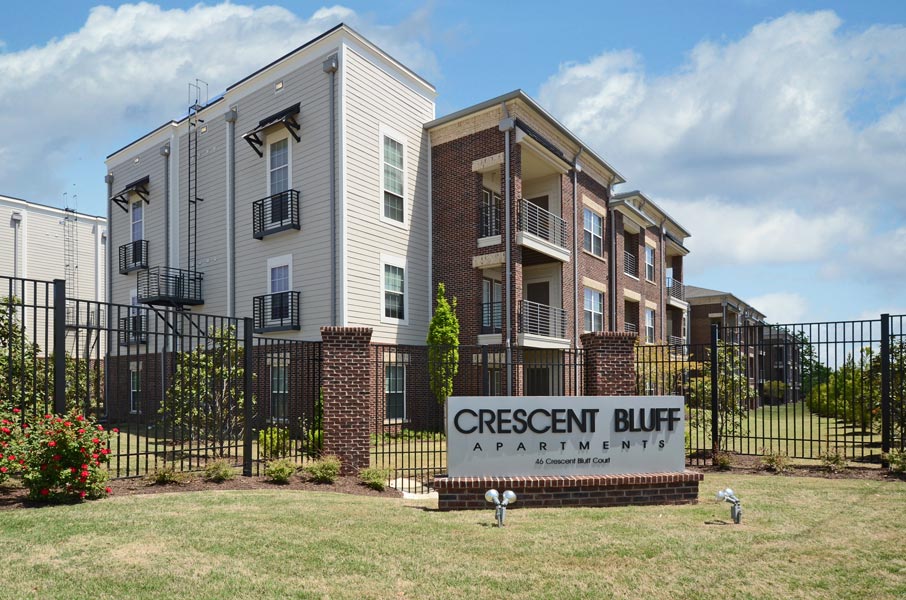 Crescent Bluff Apartments, is a 72 unit project on 4 acres in downtown Memphis. The project consists of 36 two-bedroom units and 36 three-bedroom units, Leasing / Clubhouse facility and urban pocket park. The units will range from 1,150 to 1,350 square feet. The project focuses on affordable market housing and uses a variety of local and federal incentives. The development team is using a Payment In Lieu Of Taxes, PILOT, through the Health, Education, and Housing Facility Board of the City of Memphis. Elmington Capital is also using a low-income housing tax credit, a federal program made available through the Tennessee Housing Development Authority.