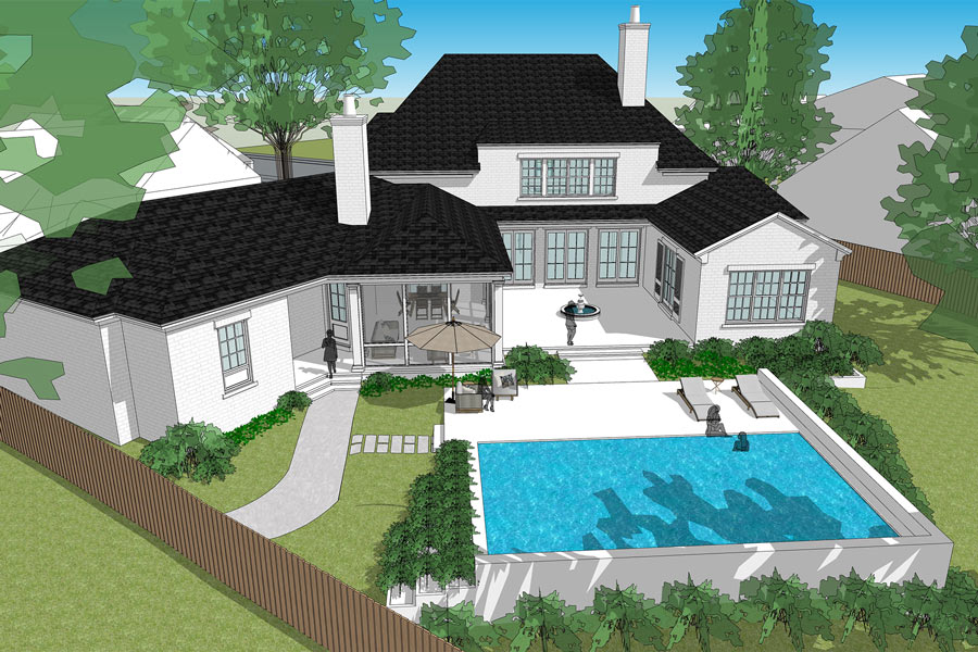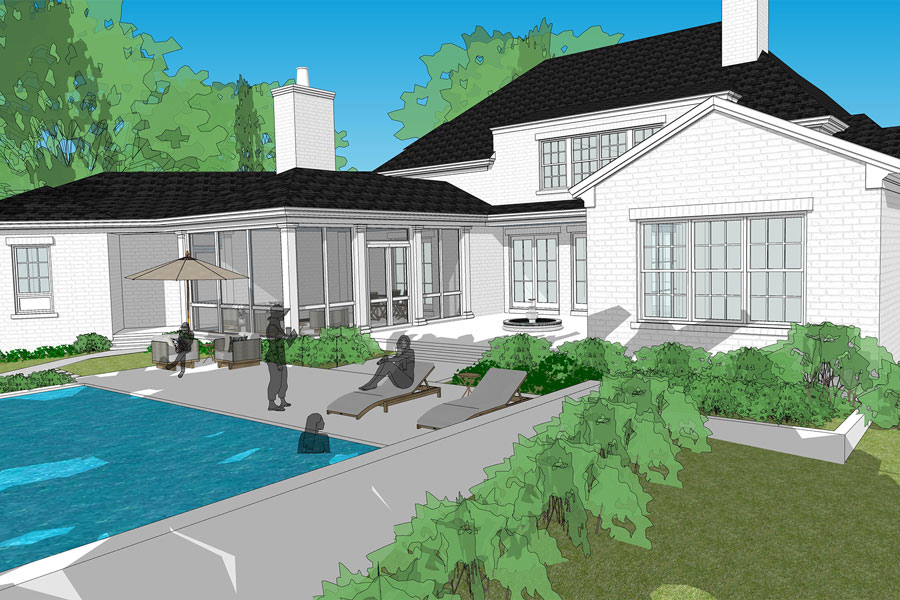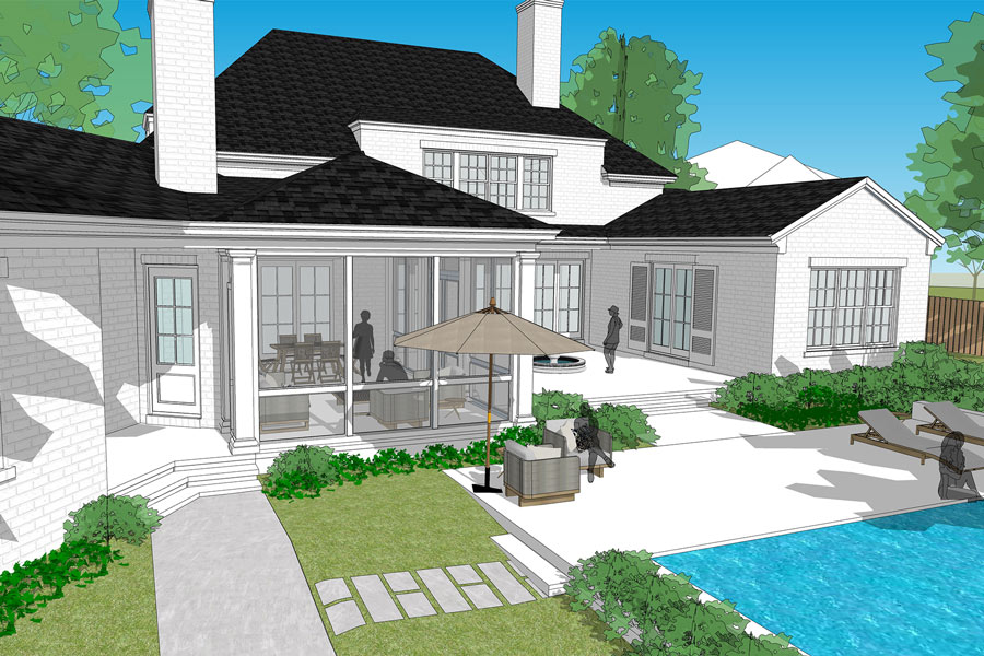 Our clients wanted to have some separation between the main rooms but the well thought layout allows the spaces to seamlessly flow into each other. The dining area features large windows to bring in the afternoon sunlight, while the living area opens to the rear yard and pool with oversized full glass French doors. Ceilings make a statement in this house, with dropped decorative beams in the living room and a barrel vault underling the transition from the foyer into the living. The vaulted ceilings in the primary bedroom and screened porch expand the rooms volume and emphasize the vertical lines. The screened porch is perfectly integrated into the outdoor space and blends beautifully with the architecture, creating a private courtyard ideal for hosting friends and family gatherings. Unique design gems like quaint niches, hidden hallways and secret doors are located throughout the house and provide a sense of mystery and surprise.