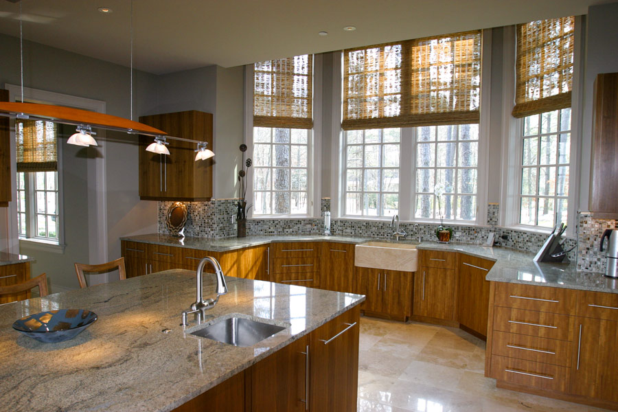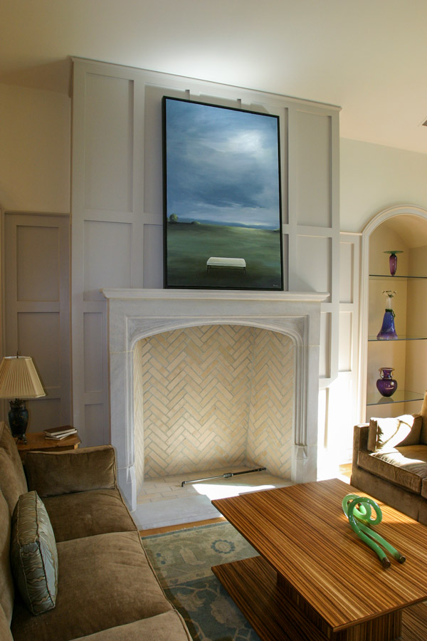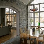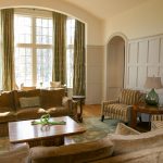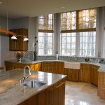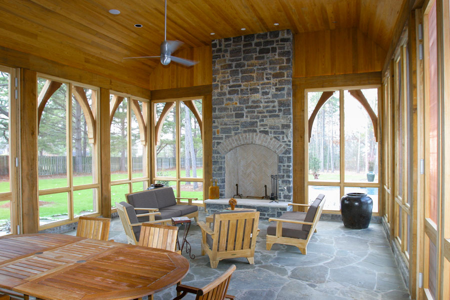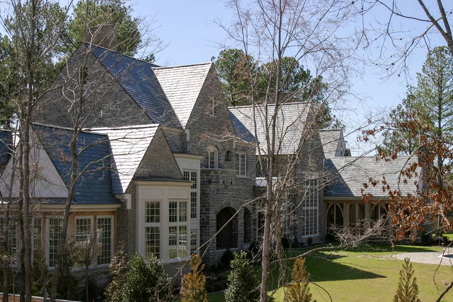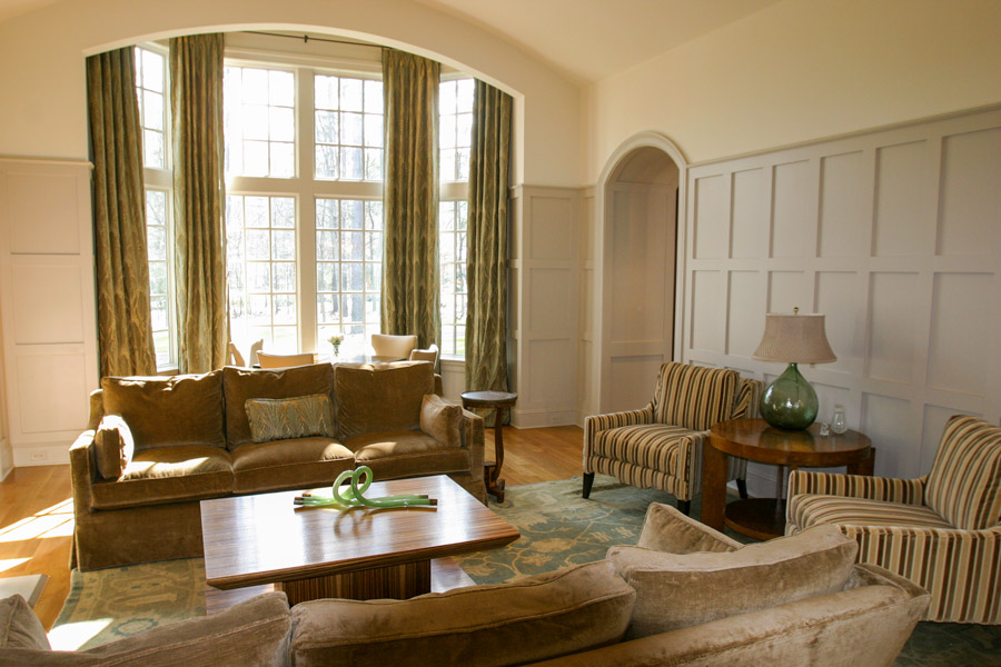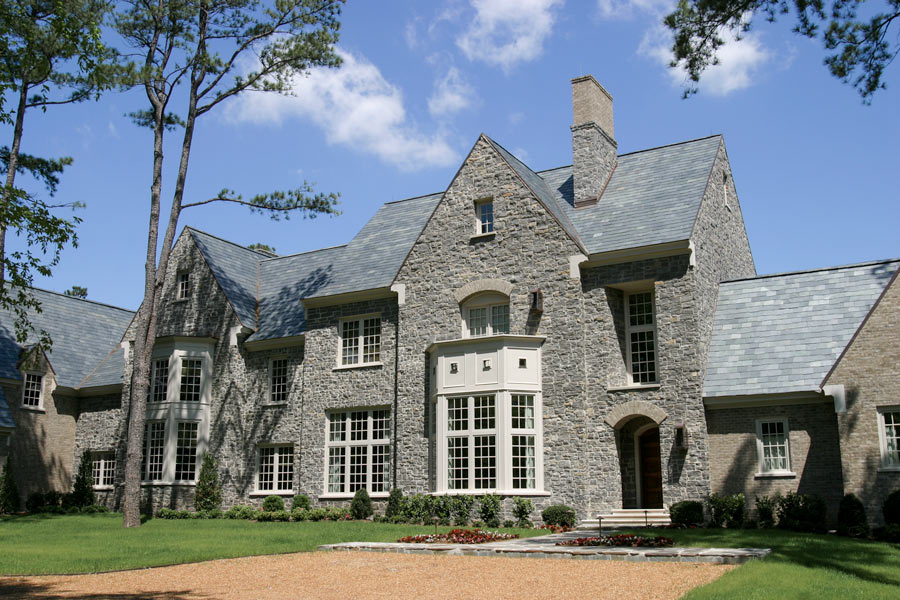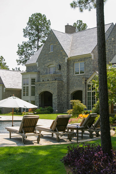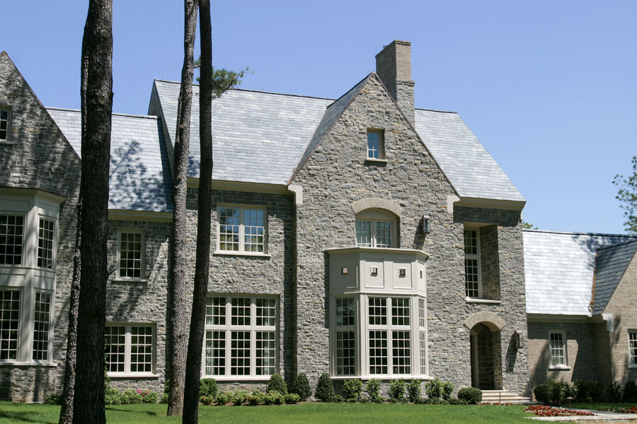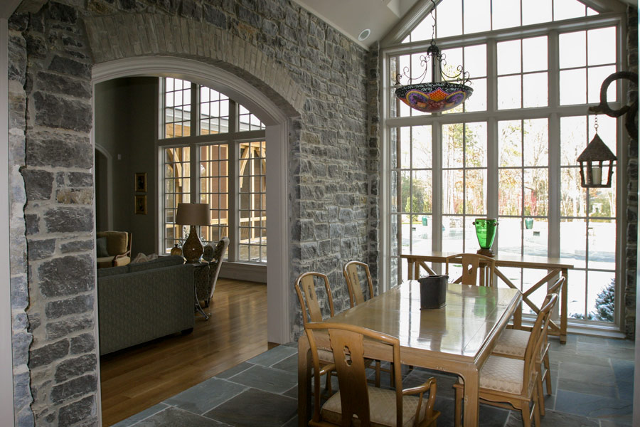 Resting on an estate lot in suburban Germantown, an English Manor home’s grandeur and presence stand up to the vastness of its wooded surrounding. The house was designed in a linear fashion and enveloped in windows that frame the sweeping panoramic views of the serene setting. The tremendously scaled windows invite nature in as part of the decor as they make the walls become invisible. Upon arrival along a pea gravel drive that exudes a welcoming sound reminiscent of old county gravel roads, one is greeted by the handsome hand-cut stone that is adorned with perfectly detailed cornice and bay window trim, setting the stage for perfect synchrony of old English details. The open floor plan of the lineal design allows for effortless movement from room to room. The clean lines of the furnishings echo the sophisticated silhouette of the design and mingle with the use of natural materials that affords the space a degree of warmth. The family room, kitchen, and great room open up to the site and have access to a covered porch and a screened porch which were both designed off the axis of these rooms in order to preserve the views out while maintaining close proximity. A breakfast room off of the kitchen is designed as an English conservatory with a glass roof, a continuation of the celebration of the site. The catering to the individuality of the homeowner continues throughout the house. A sleeping porch off of the master suite invites peaceful relaxation and daydreaming as it injects personality into the home and an easygoing atmosphere to its elegant order.