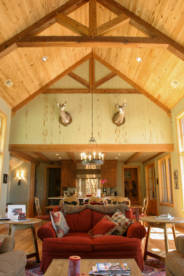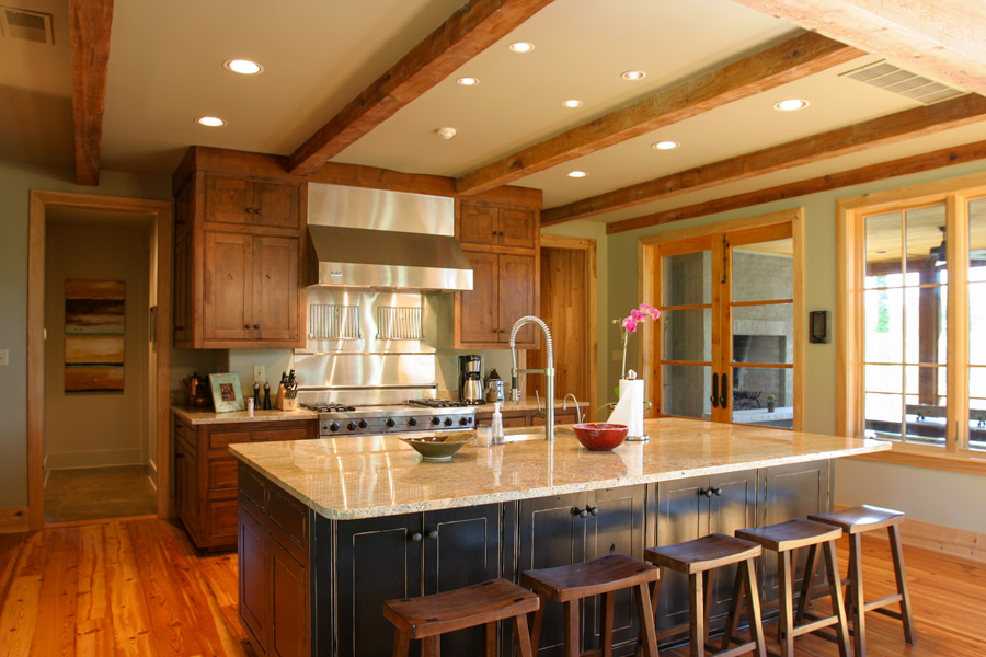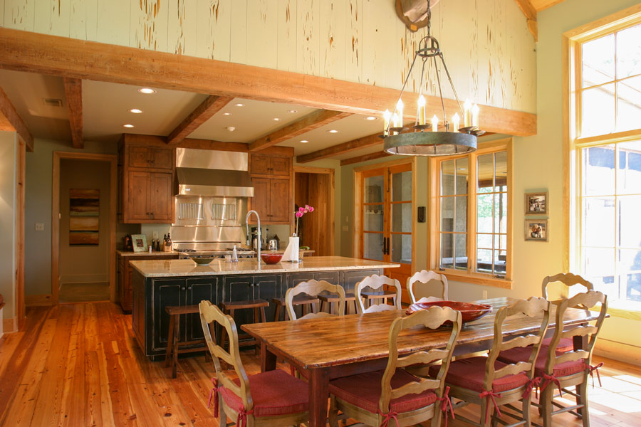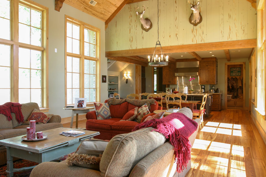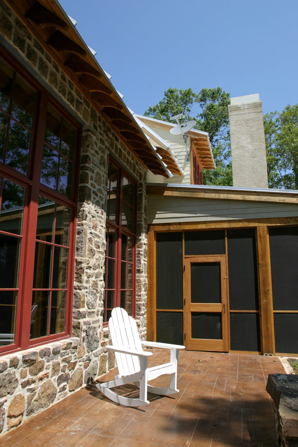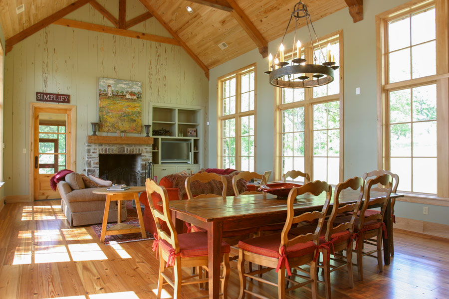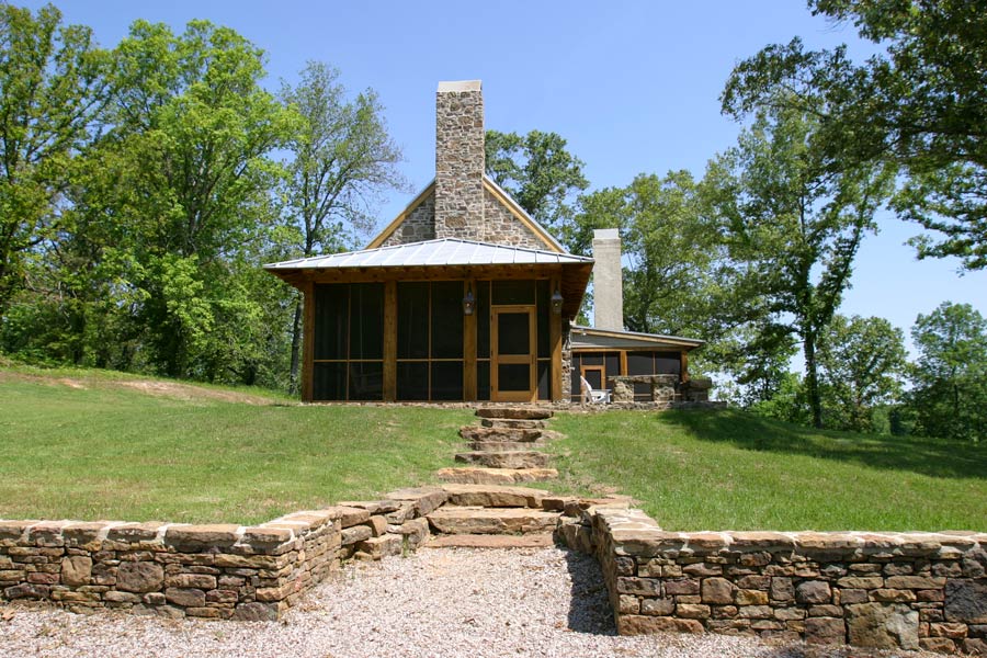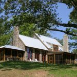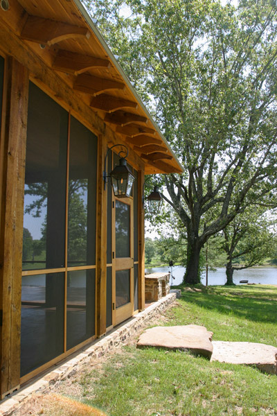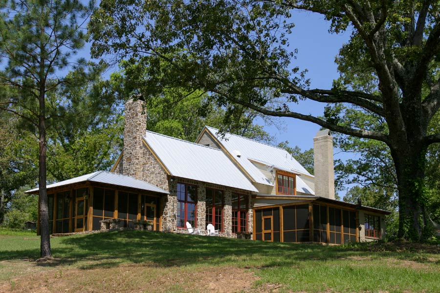 This countryside farmhouse located in rural Mississippi incorporates local natural materials with a slight contemporary infusion into traditional, vernacular architecture. Part of the country life includes outdoor living and entertaining, which this house addresses with two, separate, screened porches. Each porch is anchored by a large masonry fireplace that facilitates outdoor use year round and provides an idyllic setting for lighting a fire as the sun sets. A rear terrace extends off of the family room, an indulgent area for solace and retreat into nature. The interior is a textured warmth of natural materials and comfortable sitting and sleeping arrangements that celebrate the surroundings by welcoming in light and views through large windows. The vaulted great room that is topped with wood trusses is the heart of the home and serves a dual purpose of entertaining large groups or welcoming the family into its rustic yet inviting walls for spontaneous napping or relaxing.