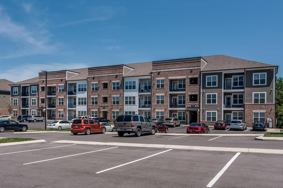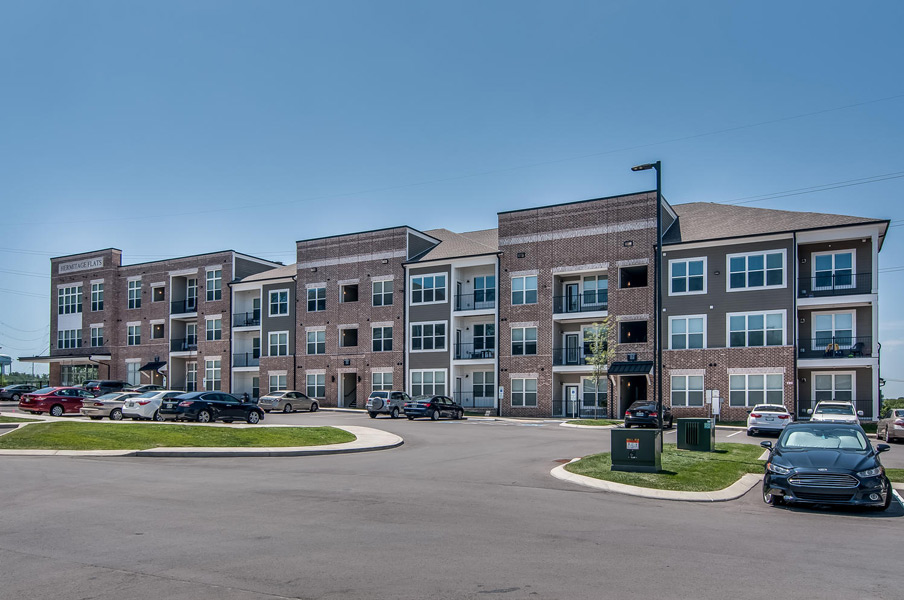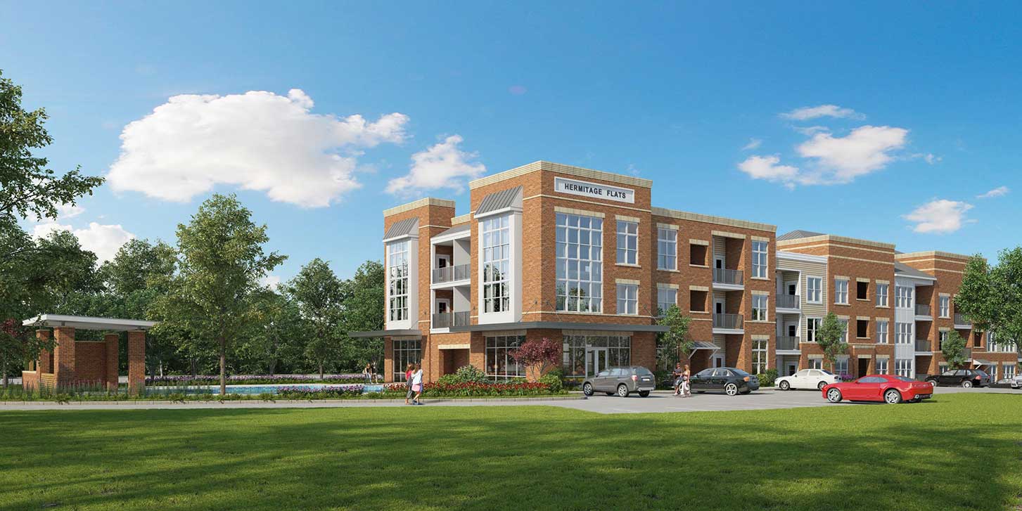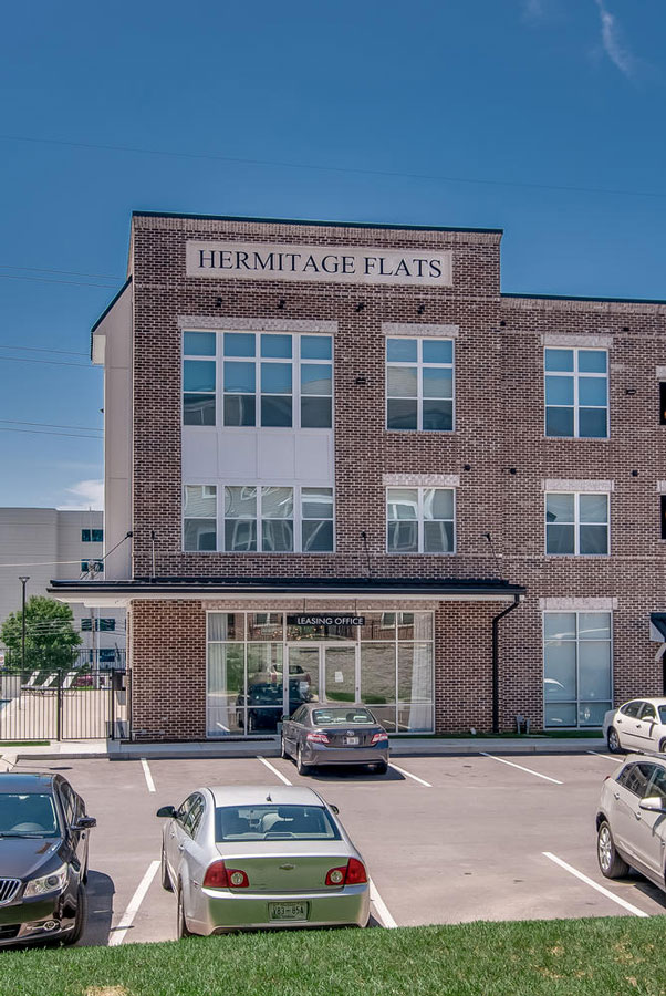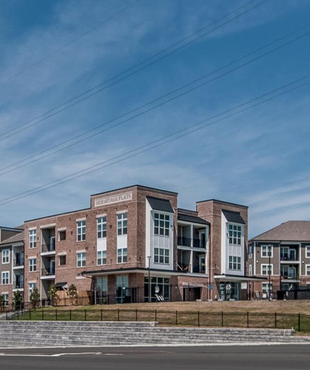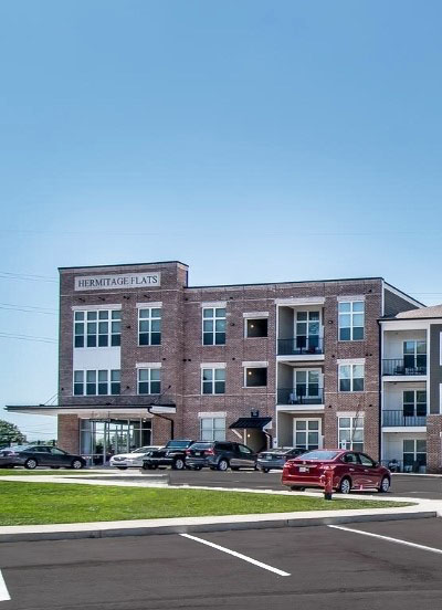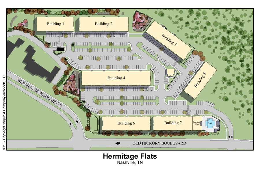 Hermitage Flats is located on Old Hickory Blvd. in Hermitage, Tennessee outside of Nashville. This project consists of seven buildings and 267 units built on a challenging grade of steep slopes with a tree preservation requirement. It is a mix of 3 and 4 story buildings with an integral Leasing Office and Clubhouse. Creating access to the primary street was a challenge but it sits on top of a highly visible hill, making the project visually prominent.