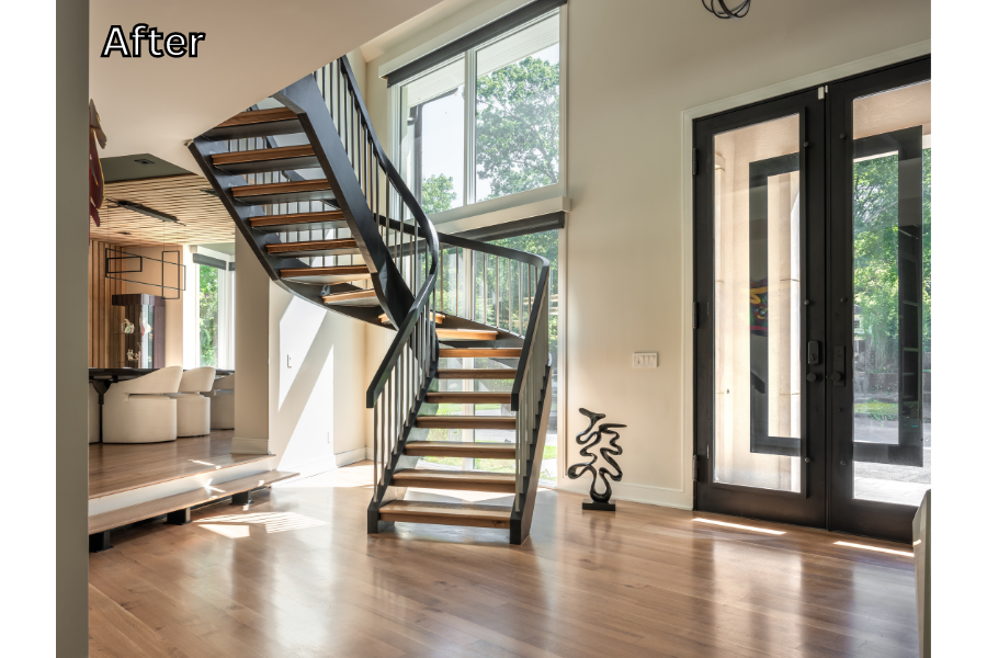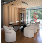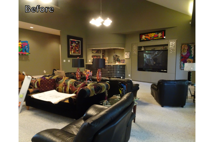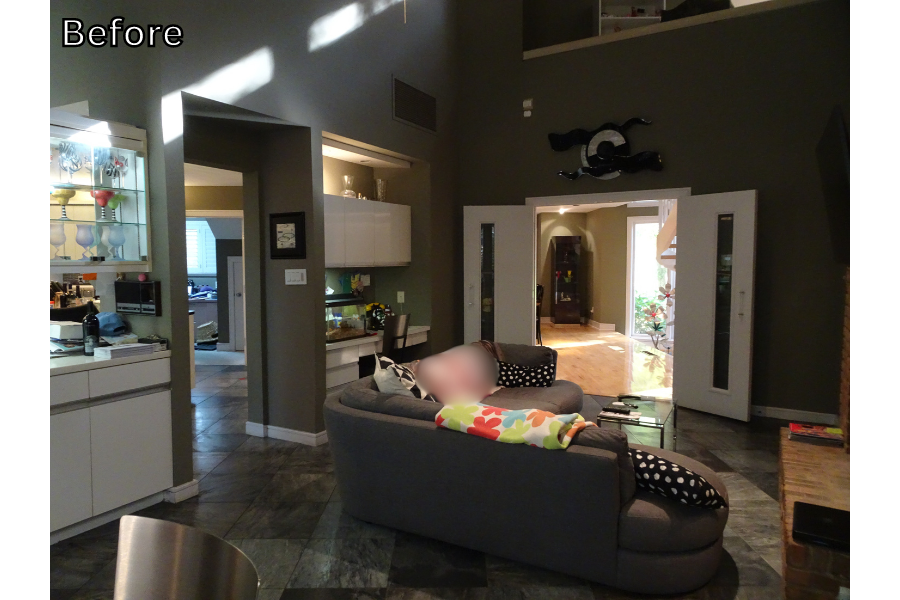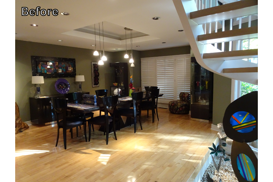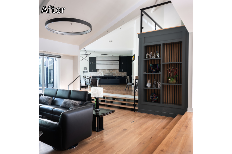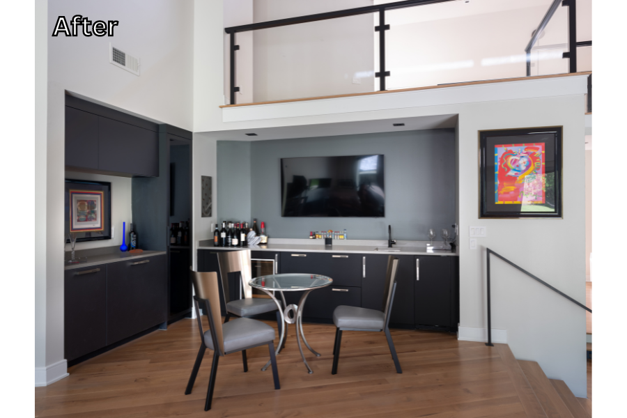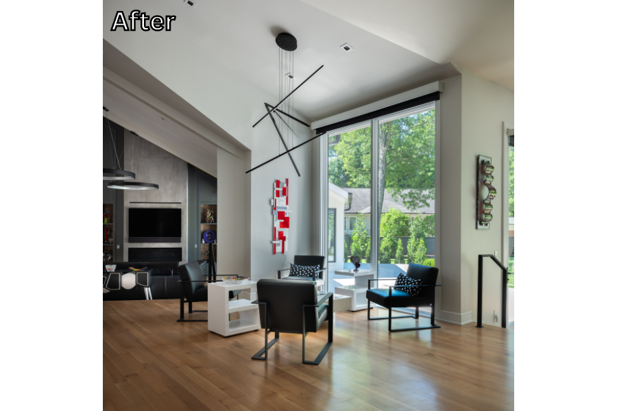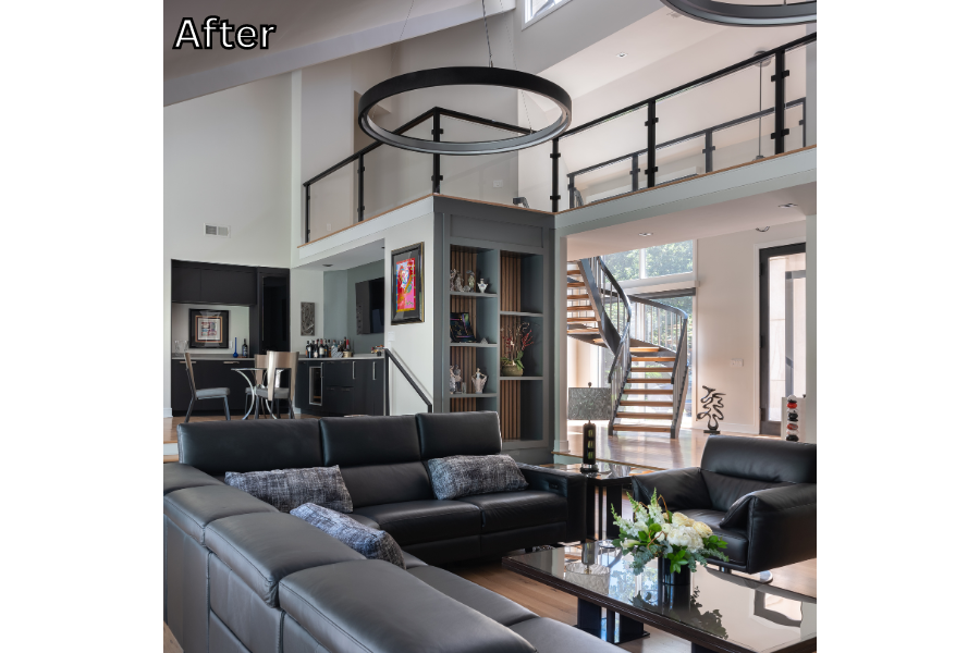 Multiple walls were knocked out to give the client a central living area, and a bar, breakfast, and dining area. An exercise room, office, screened porch, and formal dining room were added, and other spaces within the home were rearranged to achieve optimal flow. The kitchen had no light and was closed off from the gathering spaces, which now are open to see the entire area. The drab, visually unappealing railing that overlooked the living area was replaced with a glass railing, opening the walkway. The laundry room and pantry were expanded, giving the clients space that was desperately needed. Working with the architects to create displays and studying the clients’ art, finishes and fixtures chosen by Shapiro & Company Interiors throughout the home provide a modern feel, complimenting the client’s art gathered from their travels. The finished home has an open floor plan and reflects the clients’ personalities, allowing their art to be on showcase.