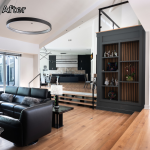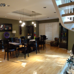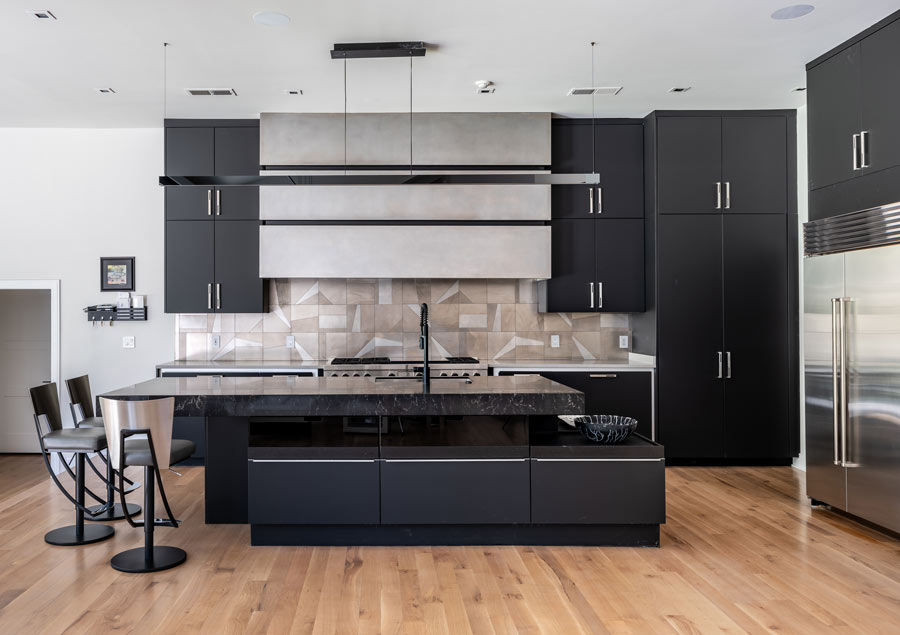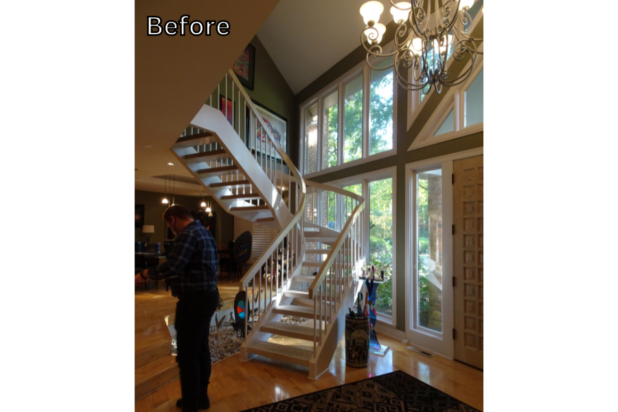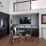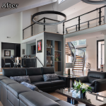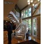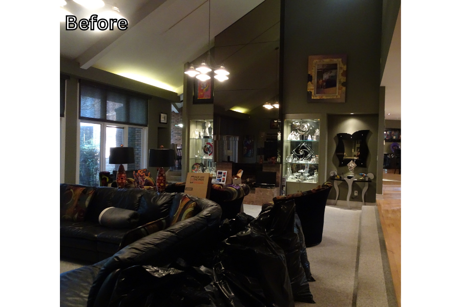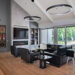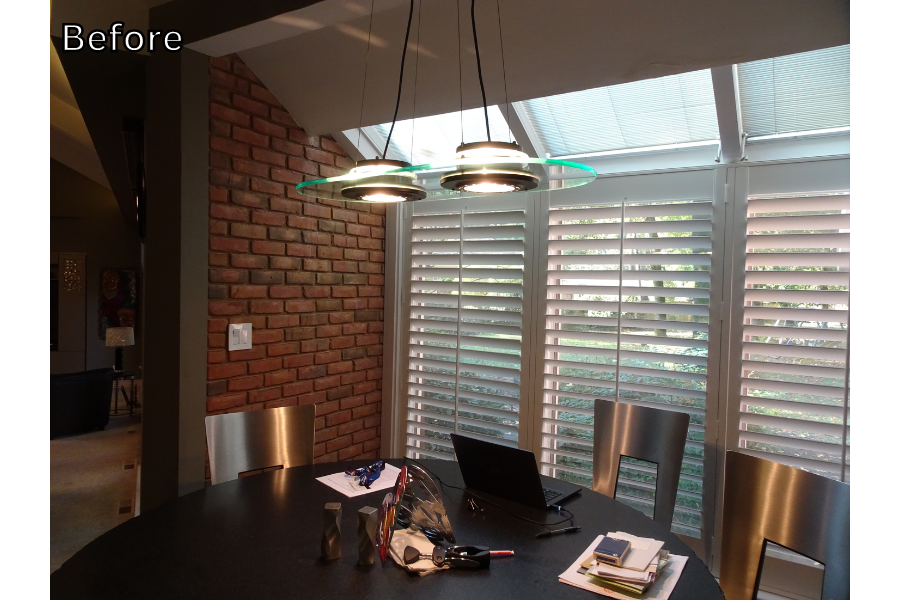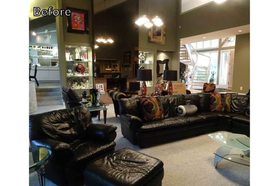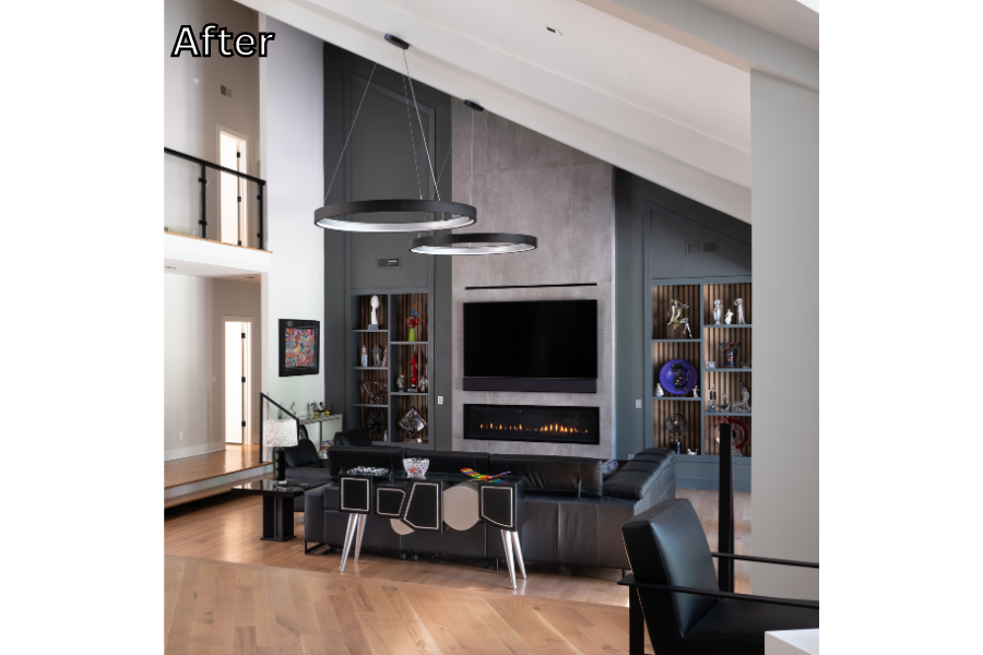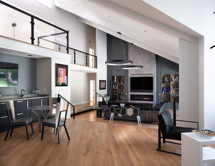 Multiple walls were knocked out to give the client a central living area, and a bar, breakfast, and dining area. An exercise room, office, screened porch, and formal dining room were added, and other spaces within the home were rearranged to achieve optimal flow. The kitchen had no light and was closed off from the gathering spaces, which now are open to see the entire area. The drab, visually unappealing railing that overlooked the living area was replaced with a glass railing, opening the walkway. The laundry room and pantry were expanded, giving the clients space that was desperately needed. Working with the architects to create displays and studying the clients’ art, finishes and fixtures chosen by Shapiro & Company Interiors throughout the home provide a modern feel, complimenting the client’s art gathered from their travels. The finished home has an open floor plan and reflects the clients’ personalities, allowing their art to be on showcase.