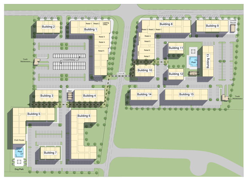 Park Place is an upcoming mixed-use project consisting of 2, 3 and 4 story buildings and 450 dwelling units with retail on the ground floor. There will be approximately 27 dwelling units per acre. The apartments will consist of 1, 2, and 3- bedroom units. Park Place will use regional historical architecture as inspiration to create a unique place with modern, high-end luxury amenities and facilities. This new community will provide pedestrian connections to adjacent town parks and schools. Central to the community identity, the beautiful nature of the main parks and trails will serve as an inspiration for an open and refreshing environment for the apartments.