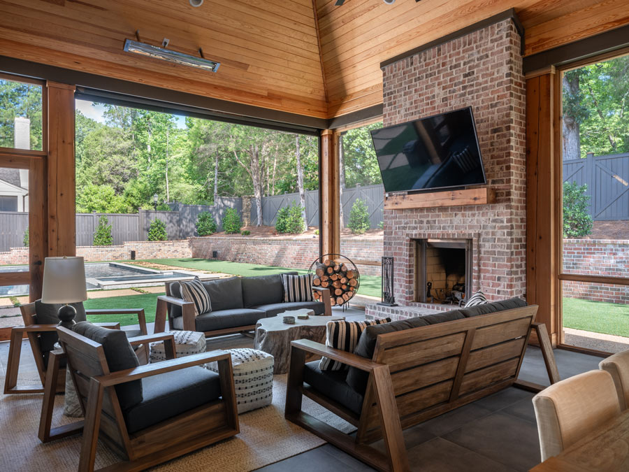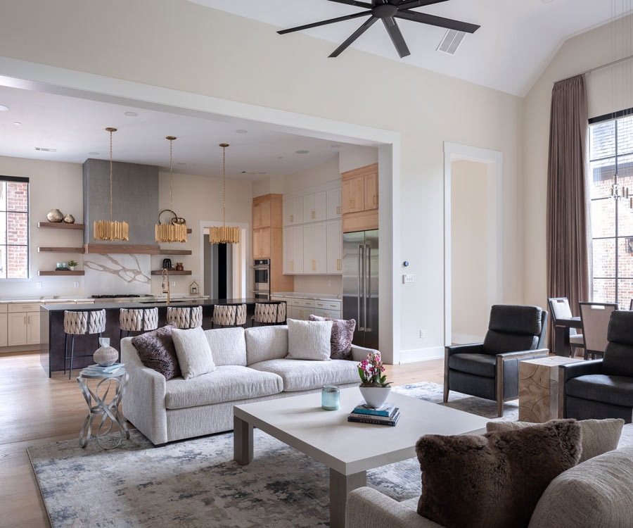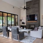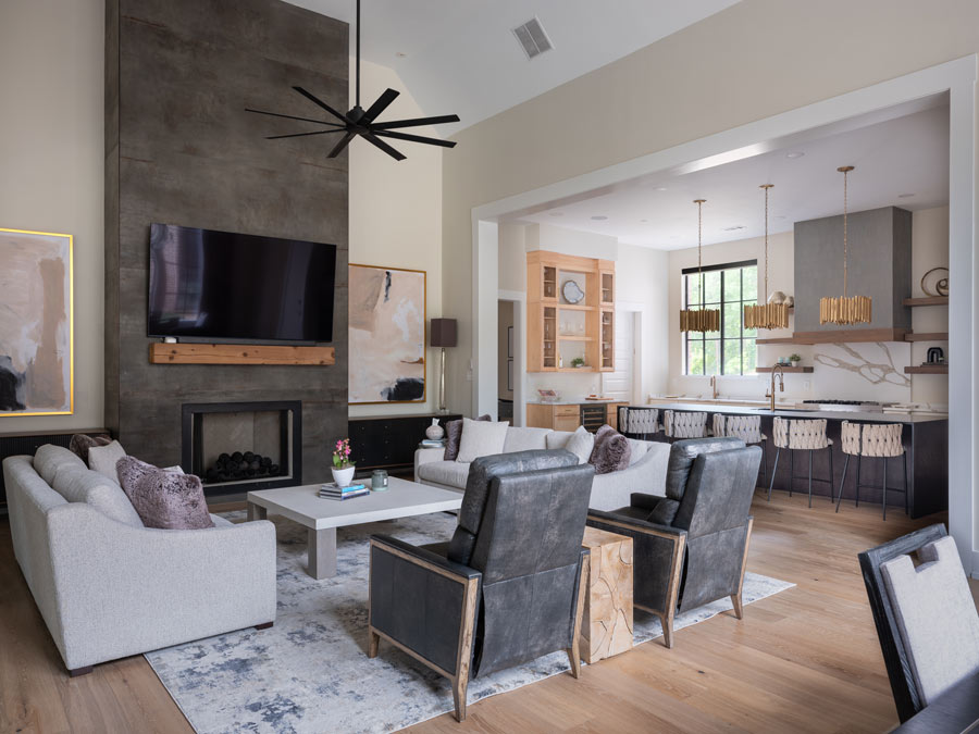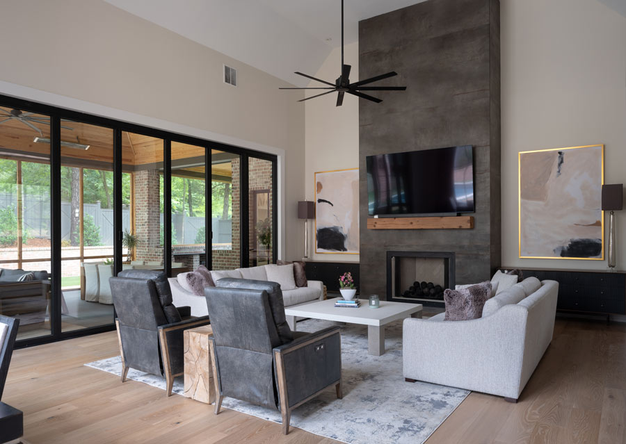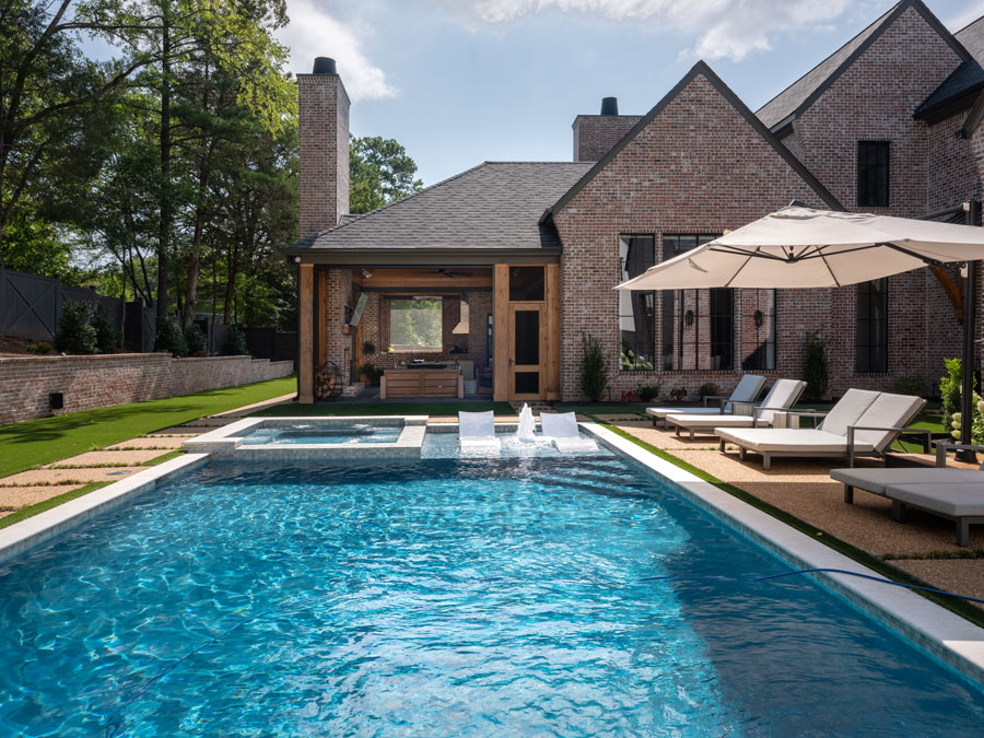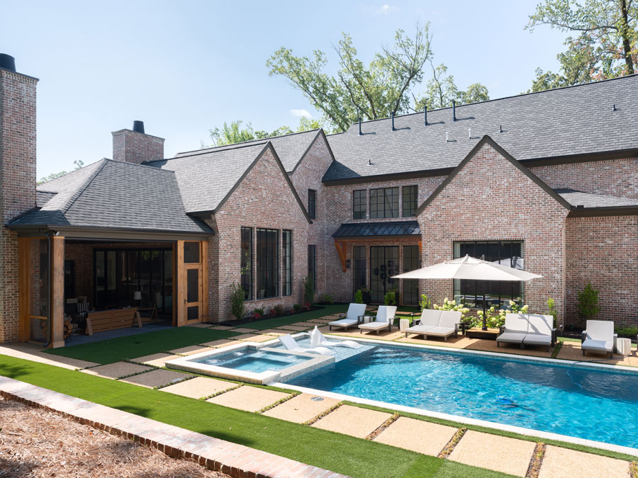 Our clients envisioned a home that would accommodate large gatherings of family and friends in a way that prioritizes comfort and connectivity. The home features five bedrooms, two home offices, a spacious primary bedroom with a luxury bathroom, his & hers closets, a retractable screened porch with grilling area and built-in seating, and a custom pool and hot tub. An open kitchen and vaulted family room, ideal for entertaining, spill into a screened porch, ensuring a seamless indoor-outdoor connection. Floor-to-ceiling windows flood every room with natural light. The guest suite is integrated into the primary residence but is strategically located to provide privacy and independent entry. The primary bedroom overlooks the pool, and a large floor-to-ceiling glass door connects their room directly to the courtyard and pool. The teenage children have their own upstairs oasis, with their own rooms, a large media room, and a built-in refreshment area.