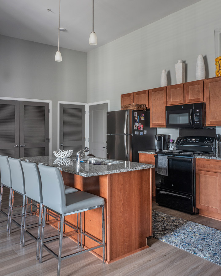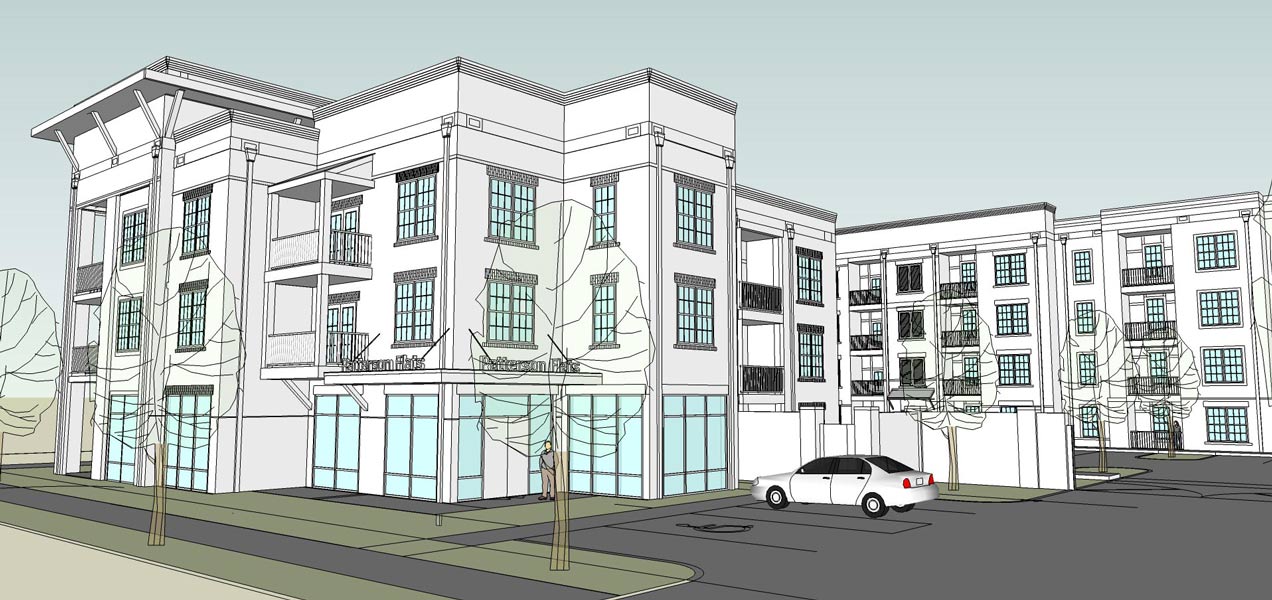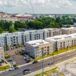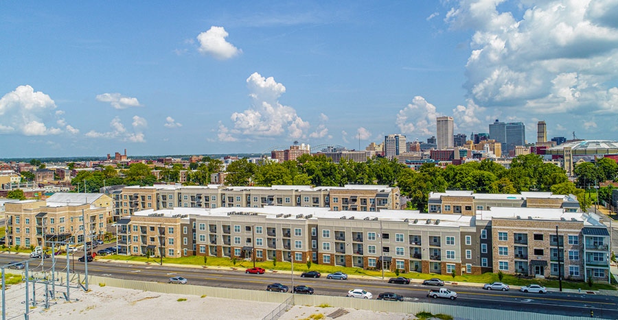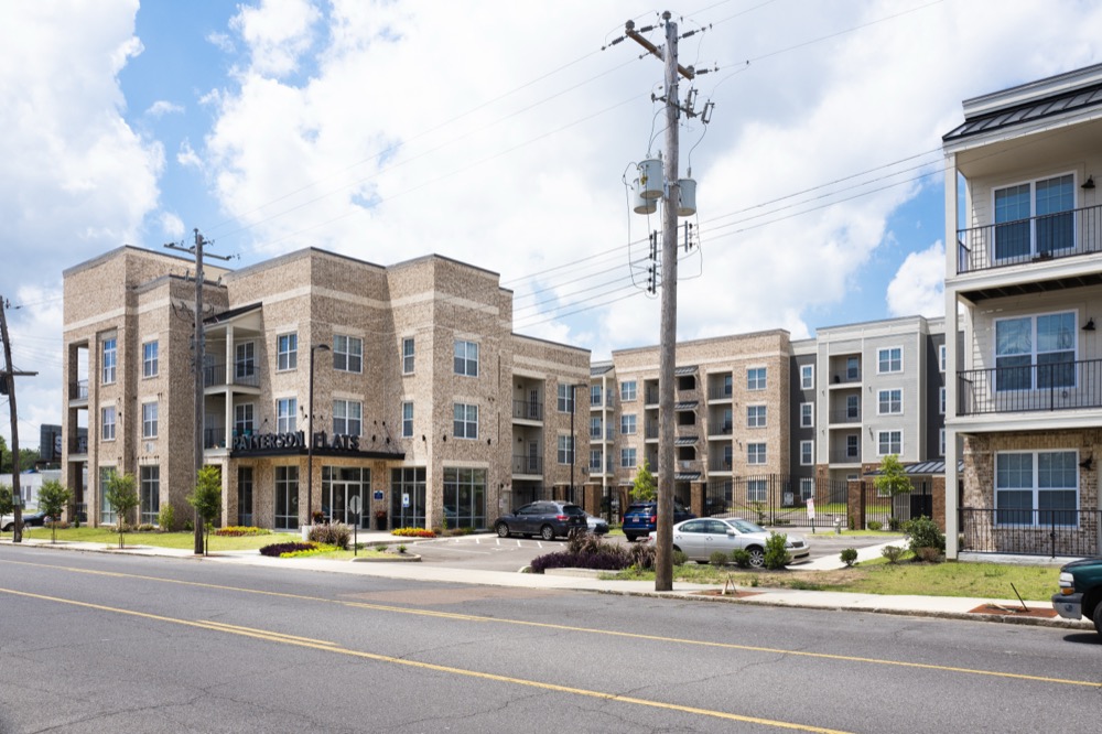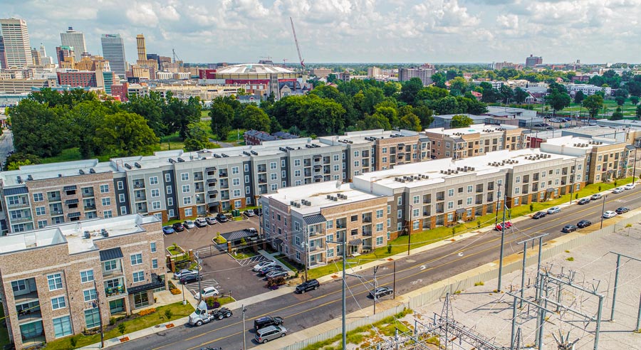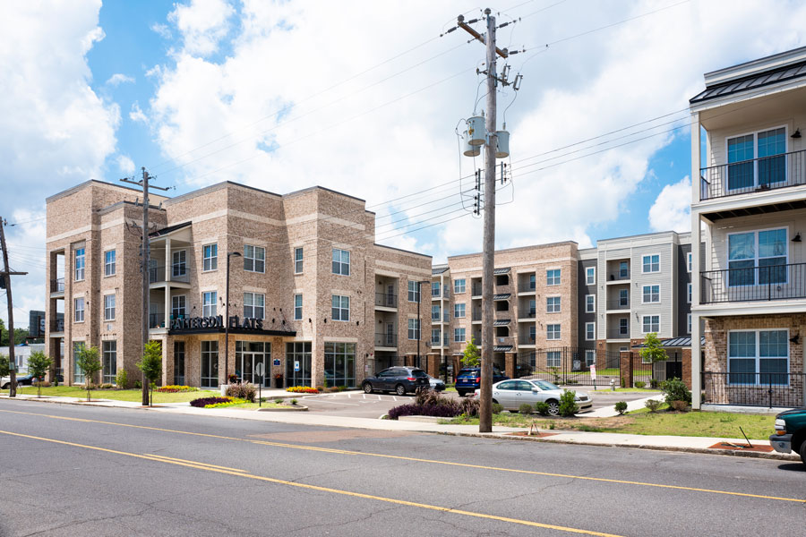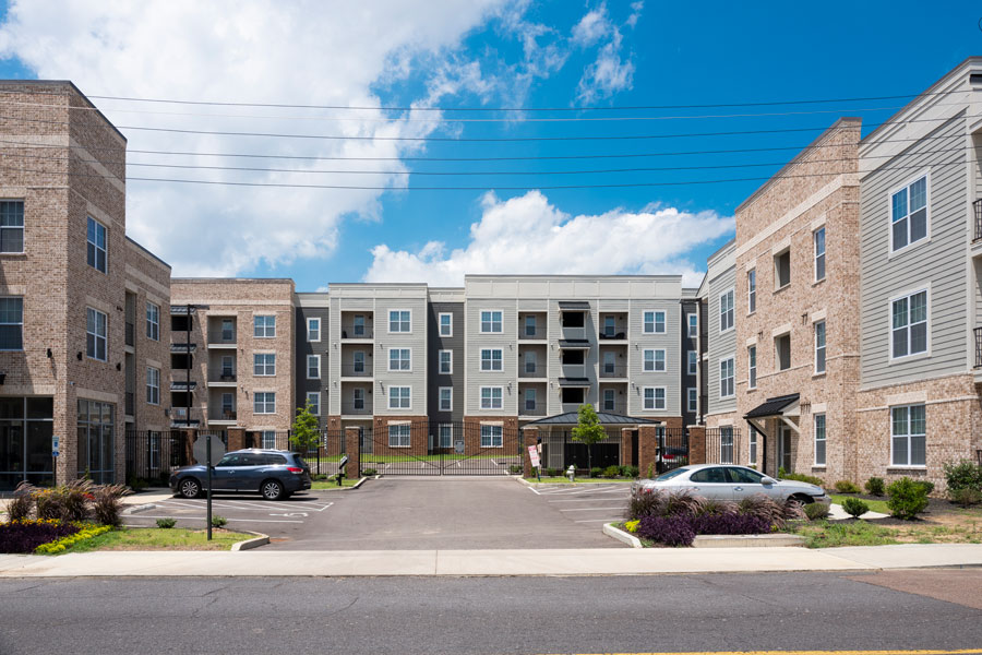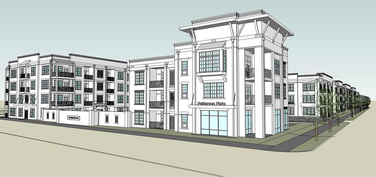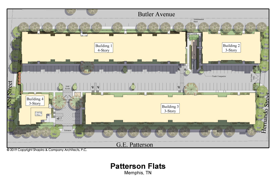 Patterson Flats in Downtown Memphis is an apartment community with 195 units including one, two and three bedrooms. The site occupies an entire city block that had to be rezoned. Three and four-story facades align with and front the streets to help define the urban edge with parking contained by interior parking courts. On-street parking will help continue the urban pattern.