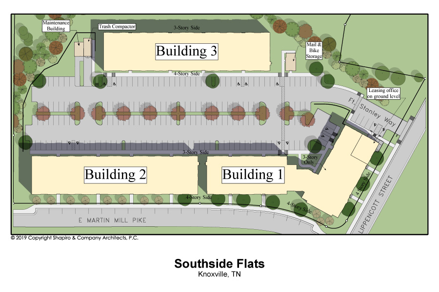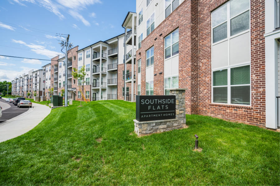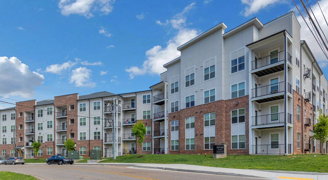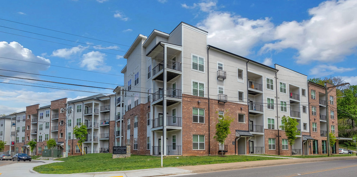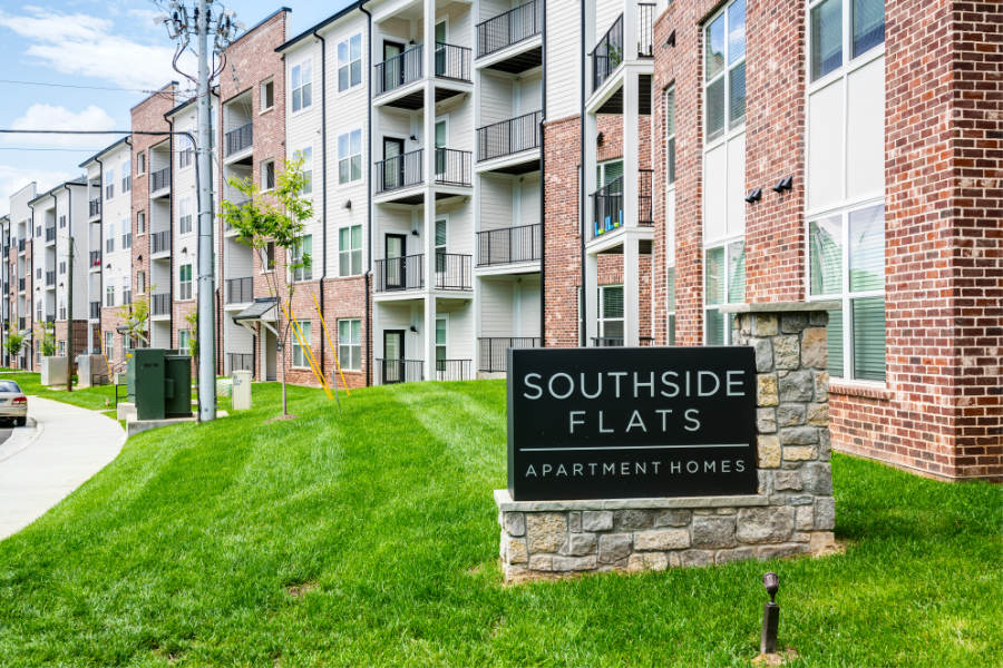 Southside Flats is an apartment project located in Knoxville, TN. It has 172 dwelling units with 1, 2, and 3-bedroom options. The 1-bedroom units are 700 sqft, the 2-bedroom units are 1,085 sqft, and the 3-bedroom units are 1,245 sqft. It consists of 3 buildings that are 3 stories or a 3/4 story split configuration. Amenities include a tenant lounge and exercise area.
