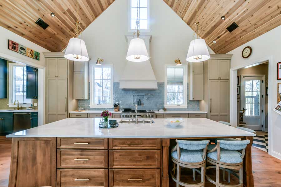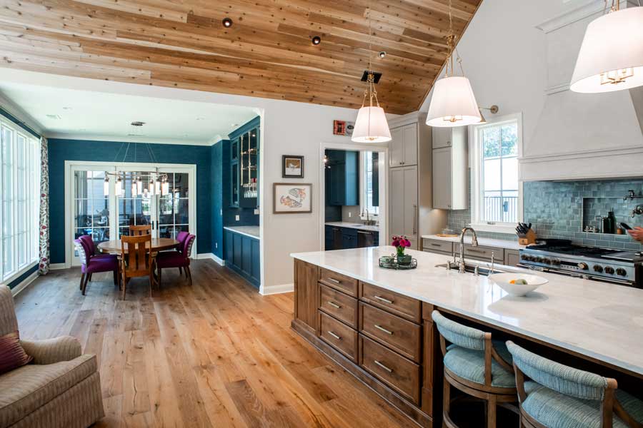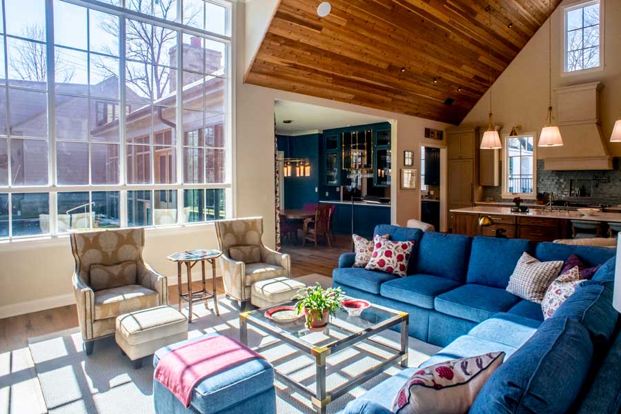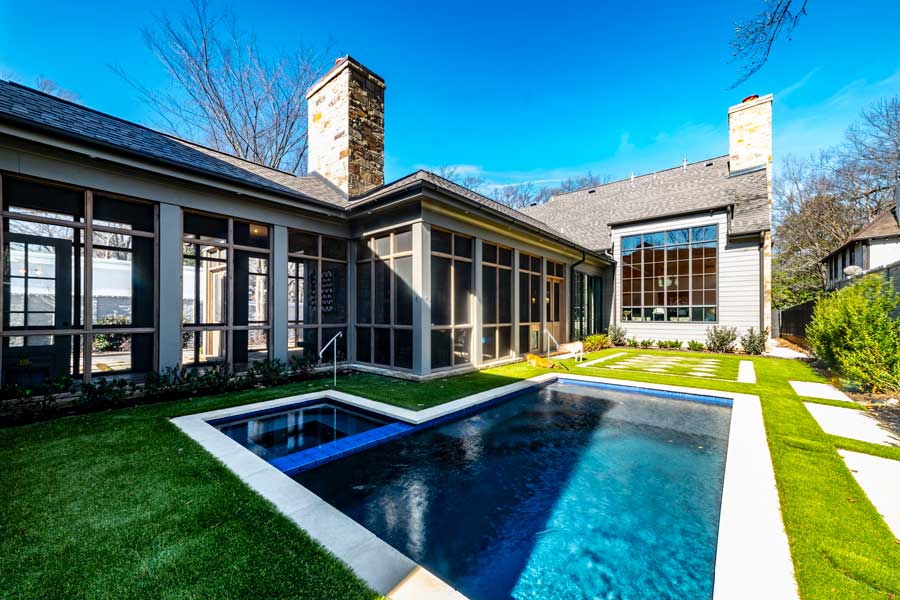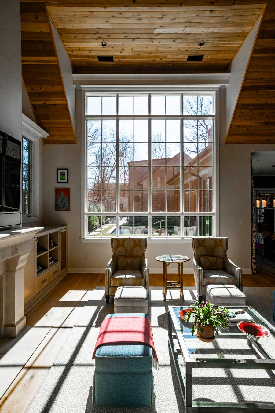The property is narrow along the street but deep which allowed the garage to be placed in the back of the property similar to the other homes in the neighborhood. With the garage on the rear, the architects created a porte-cochere on the side of the main house creating a convenient drop off reminiscent of pre-world war 2 era homes. Between the garage and the main house, a screen porch creates a welcome entry into the house and provides the back drop for the private courtyard and pool. Incorporating the wishes of the clients for an open floor plan, the kitchen, dining and family room has a vaulted ceiling overlooking the courtyard and allowing an immense amount of natural light to enter the space from three sides.