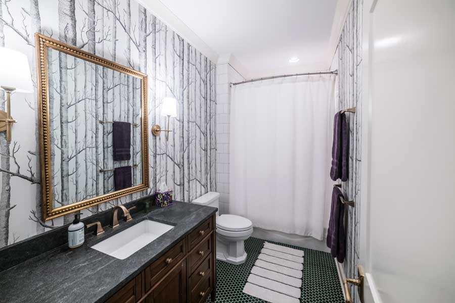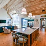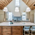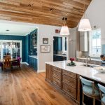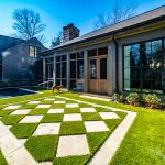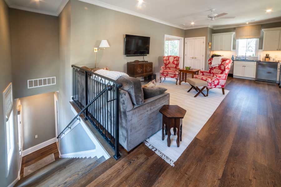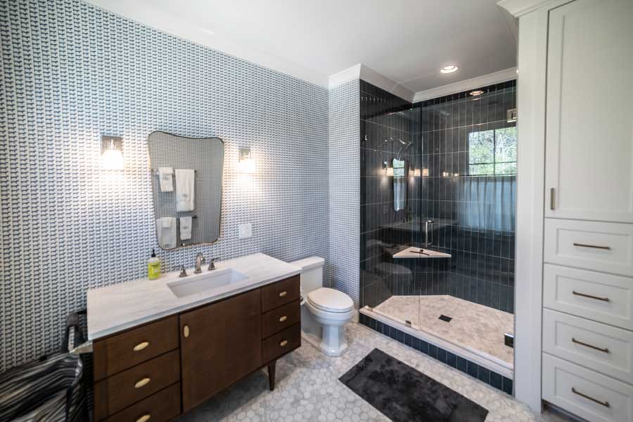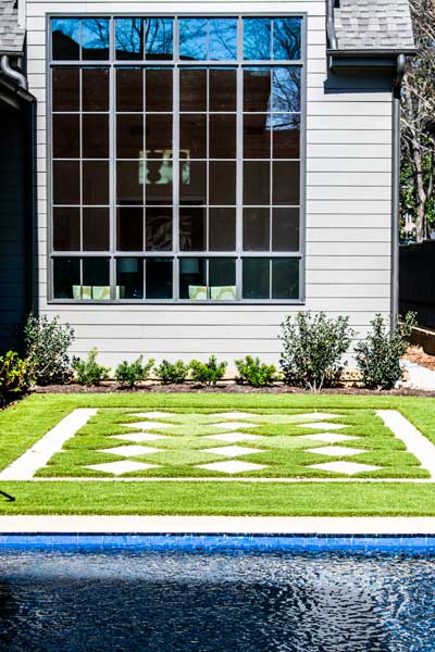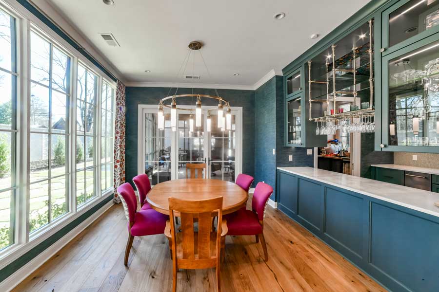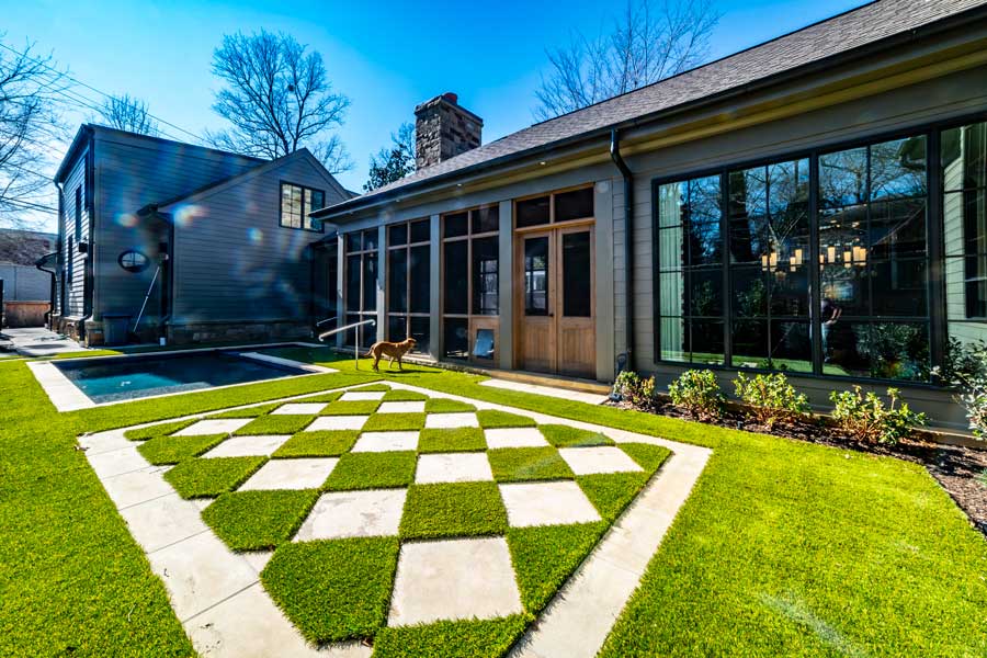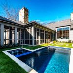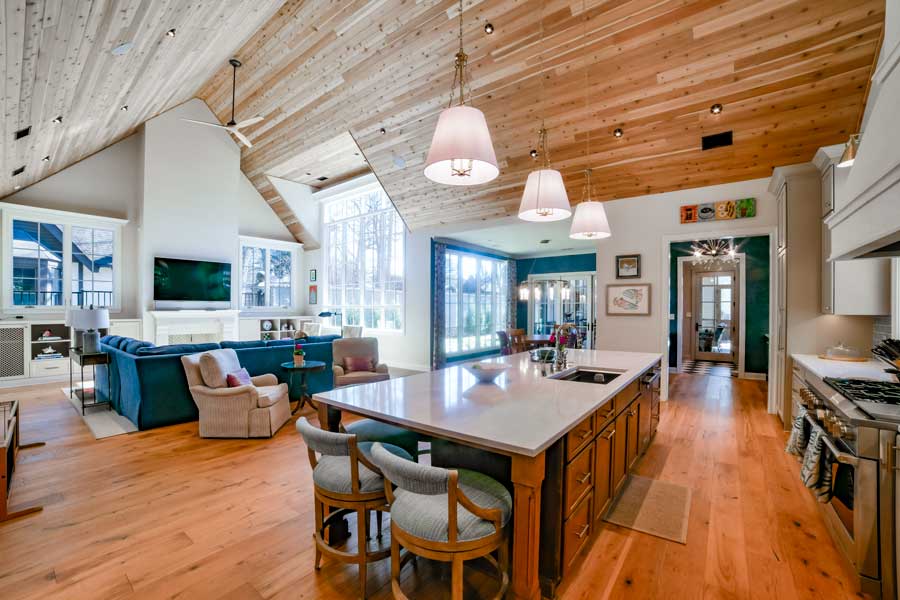 The property is narrow along the street but deep which allowed the garage to be placed in the back of the property similar to the other homes in the neighborhood. With the garage on the rear, the architects created a porte-cochere on the side of the main house creating a convenient drop off reminiscent of pre-world war 2 era homes. Between the garage and the main house, a screen porch creates a welcome entry into the house and provides the back drop for the private courtyard and pool. Incorporating the wishes of the clients for an open floor plan, the kitchen, dining and family room has a vaulted ceiling overlooking the courtyard and allowing an immense amount of natural light to enter the space from three sides.