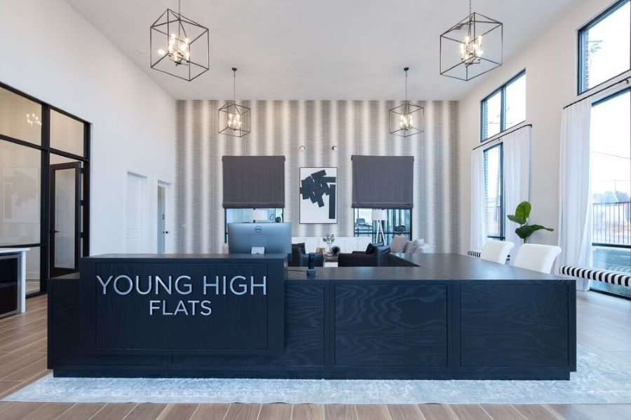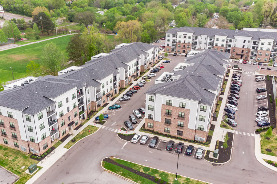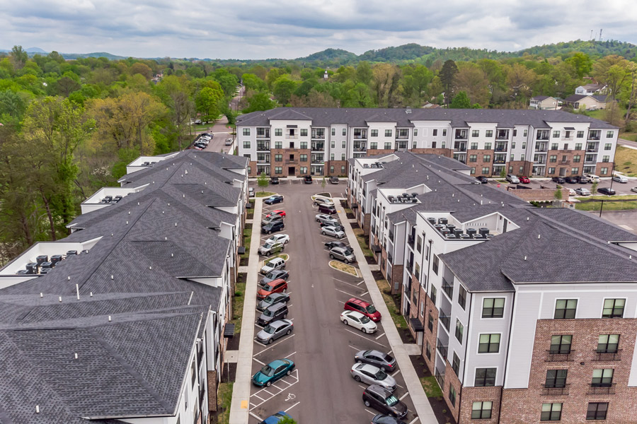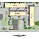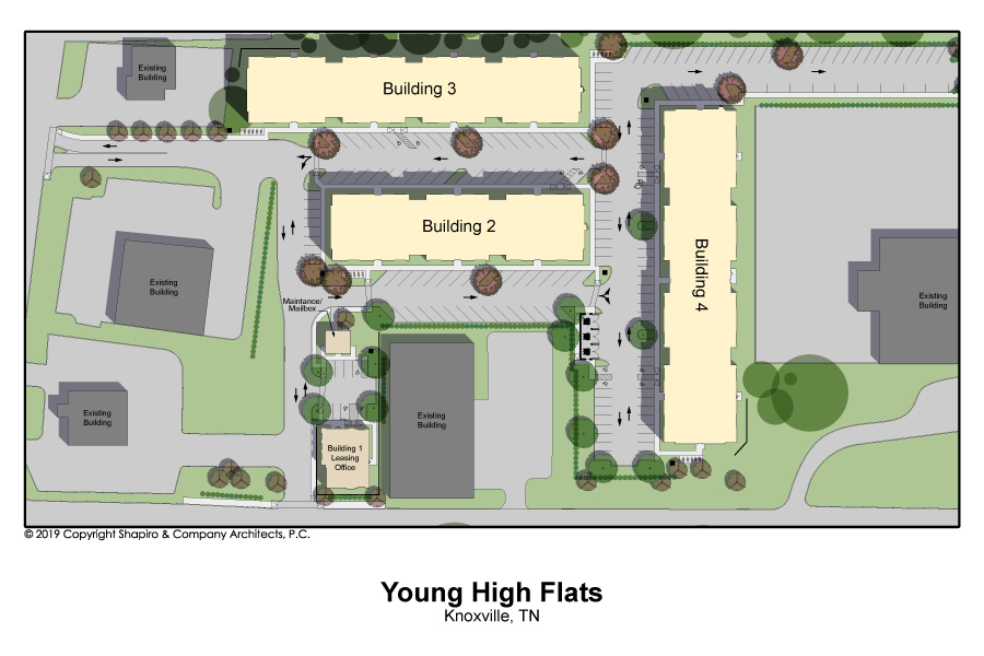 The Energy Star rated Young High Flats consists of 3 three and four-story buildings with a mix of 2 and 3-bedroom types and 156 dwelling units. Amenities will include a Fitness Center, Business Center, Bicycle Storage, detached Leasing Office, detached Mail and Laundry Facility, and a path that attaches to the public park adjacent to the property. The City of Knoxville allows reduction of car parking if properly designed bicycle parking is provided, so we have been able to incorporate that into our design.